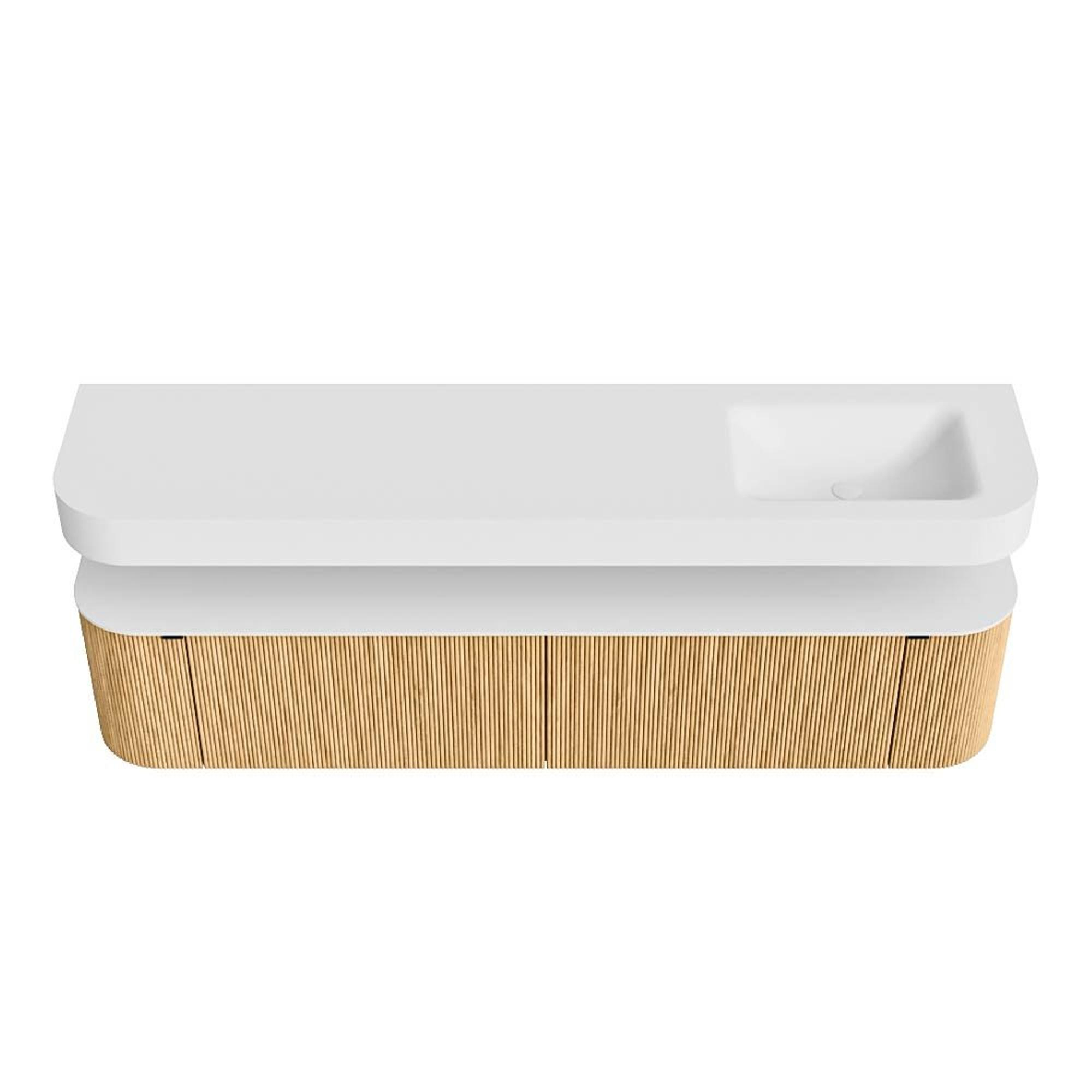 Boven het meubel zweeft een bijpassende, vrij hangende wastafel met afgeronde hoeken – perfect afgestemd op de vorm van de kast. De wastafel is uitgevoerd in Solid Surface en volgt subtiel de lijnen van het onderliggende meubel, waardoor een harmonieus geheel ontstaat. Het Solid Surface topblad vormt een sterke, onderhoudsvriendelijke basis en maakt de combinatie compleet.