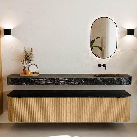 MONDIAZ THOR-DLUX 200cm meuble de salle de bains arrondi gauche + droite couleur Chêne avec 2 tiroirs et 2 portes. Vasque suspendue CLOUD Droite sans trou de robinet couleur Lava.