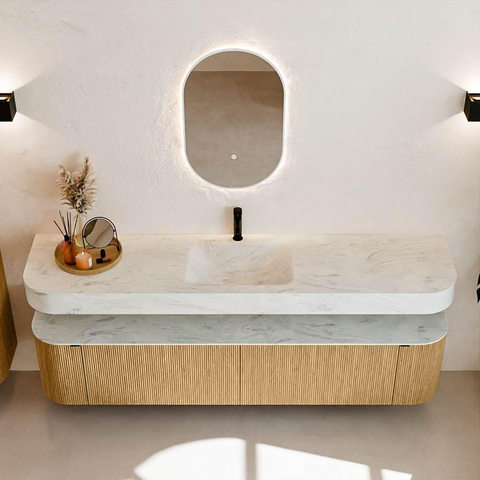 Au-dessus du meuble flotte une vasque suspendue assortie aux coins arrondis – parfaitement adaptée à la forme du meuble. La vasque est réalisée en Solid Surface et suit subtilement les lignes du meuble inférieur, créant ainsi un ensemble harmonieux. Le plan de travail en Solid Surface forme une base solide et facile d'entretien et complète la combinaison.