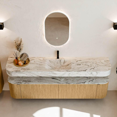 MONDIAZ THOR-DLUX 200cm meuble de salle de bains arrondi gauche + droite couleur Oak avec 2 tiroirs et 2 portes. Vasque suspendue CLOUD Milieu 1 trou de robinet couleur Glace.
