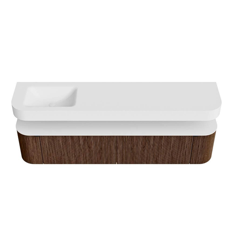 Boven het meubel zweeft een bijpassende, vrij hangende wastafel met afgeronde hoeken – perfect afgestemd op de vorm van de kast. De wastafel is uitgevoerd in Solid Surface en volgt subtiel de lijnen van het onderliggende meubel, waardoor een harmonieus geheel ontstaat. Het Solid Surface topblad vormt een sterke, onderhoudsvriendelijke basis en maakt de combinatie compleet.