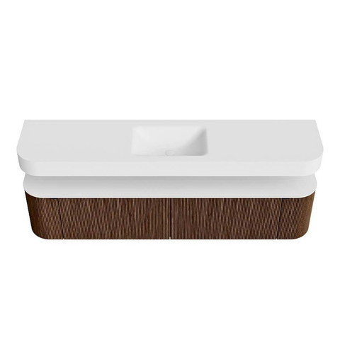 Boven het meubel zweeft een bijpassende, vrij hangende wastafel met afgeronde hoeken – perfect afgestemd op de vorm van de kast. De wastafel is uitgevoerd in Solid Surface en volgt subtiel de lijnen van het onderliggende meubel, waardoor een harmonieus geheel ontstaat. Het Solid Surface topblad vormt een sterke, onderhoudsvriendelijke basis en maakt de combinatie compleet.