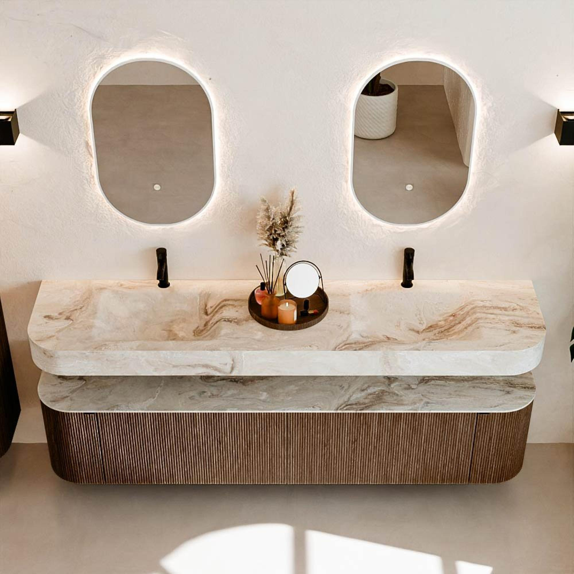 MONDIAZ THOR-DLUX 200cm meuble de salle de bains arrondi gauche + droite couleur Walnut avec 2 tiroirs et 2 portes. Vasque suspendue CLOUD Double 2 trous de robinet couleur Frappe.