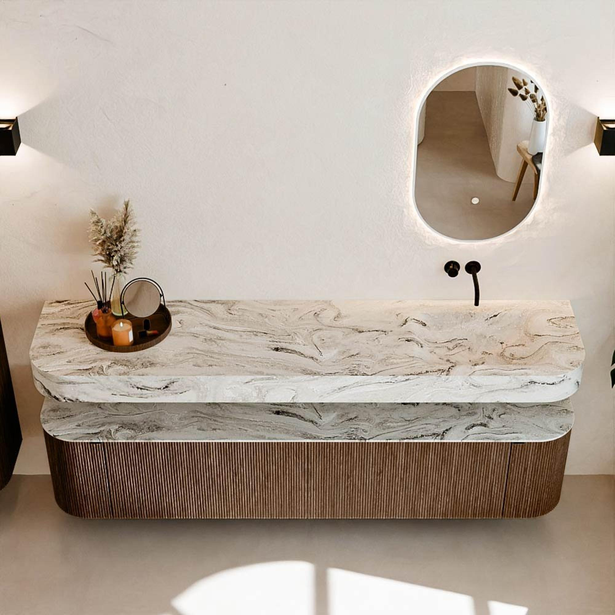 Matériaux naturels dans des tons chauds. Les cannelures verticales apportent rythme et texture au design, tandis que le chêne confère une apparence chaleureuse et artisanale. Choisissez parmi 5 teintes de bois OAK, WALNUT, DUSK, SHADOW et RUBY, des couleurs de bois soigneusement sélectionnées pour enrichir les salles de bains modernes et classiques.