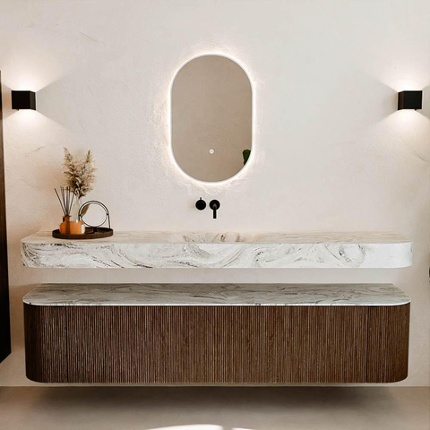 Matériaux naturels dans des tons chauds. Les nervures verticales apportent rythme et texture au design, tandis que le chêne confère une apparence chaleureuse et artisanale. Choisissez parmi 5 teintes de bois OAK, WALNUT, DUSK, SHADOW et RUBY, des couleurs de bois soigneusement sélectionnées pour enrichir les salles de bains modernes et classiques.