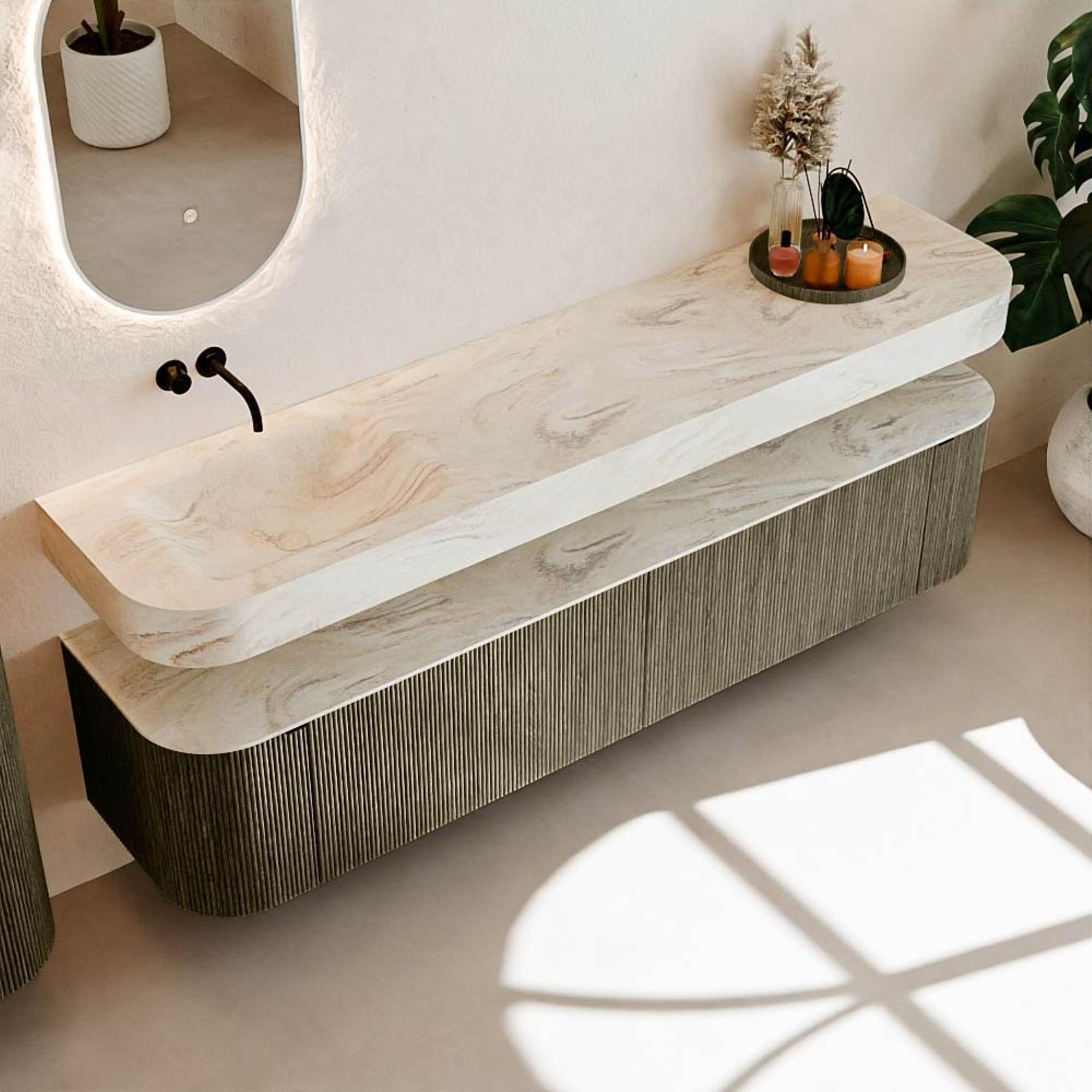 Au-dessus du meuble flotte une vasque suspendue assortie aux coins arrondis – parfaitement adaptée à la forme du meuble. La vasque est en Solid Surface et suit subtilement les lignes du meuble inférieur, créant ainsi un ensemble harmonieux. Le plan de travail en Solid Surface forme une base solide et facile d'entretien et complète la combinaison.