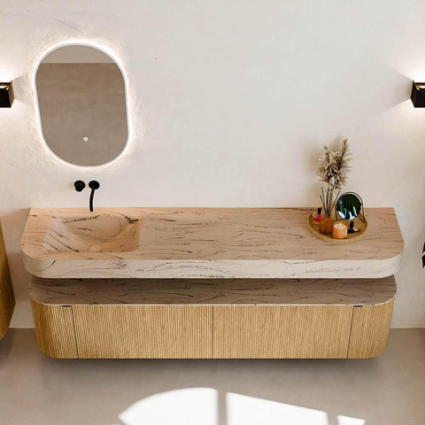 Au-dessus du meuble flotte une vasque suspendue assortie aux coins arrondis – parfaitement adaptée à la forme du meuble. La vasque est réalisée en Solid Surface et suit subtilement les lignes du meuble inférieur, créant une harmonie parfaite. Le plan de travail en Solid Surface forme une base solide, facile d'entretien et complète la combinaison.