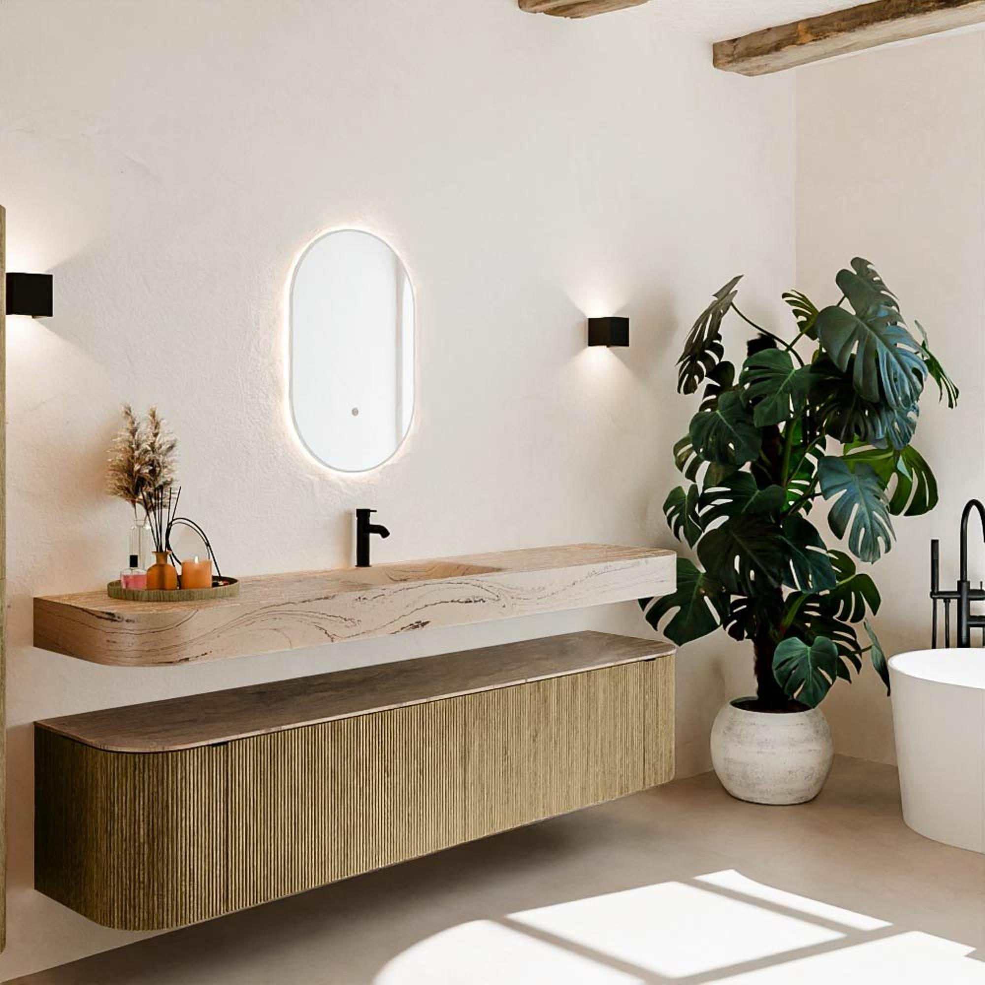Matériaux naturels dans des tons chauds. Les nervures verticales apportent rythme et texture au design, tandis que le chêne confère une apparence chaleureuse et artisanale. Choisissez parmi 5 teintes de bois OAK, WALNUT, DUSK, SHADOW et RUBY, des couleurs de bois soigneusement sélectionnées pour enrichir les salles de bains modernes et classiques.