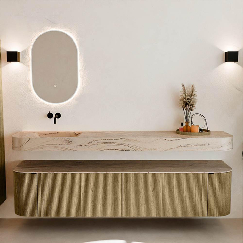 Matériaux naturels dans des tons chauds. Les cannelures verticales apportent rythme et texture au design, tandis que le chêne confère une apparence chaleureuse et artisanale. Choisissez parmi 5 teintes de bois OAK, WALNUT, DUSK, SHADOW et RUBY, des couleurs de bois soigneusement sélectionnées pour enrichir les salles de bains modernes et classiques.