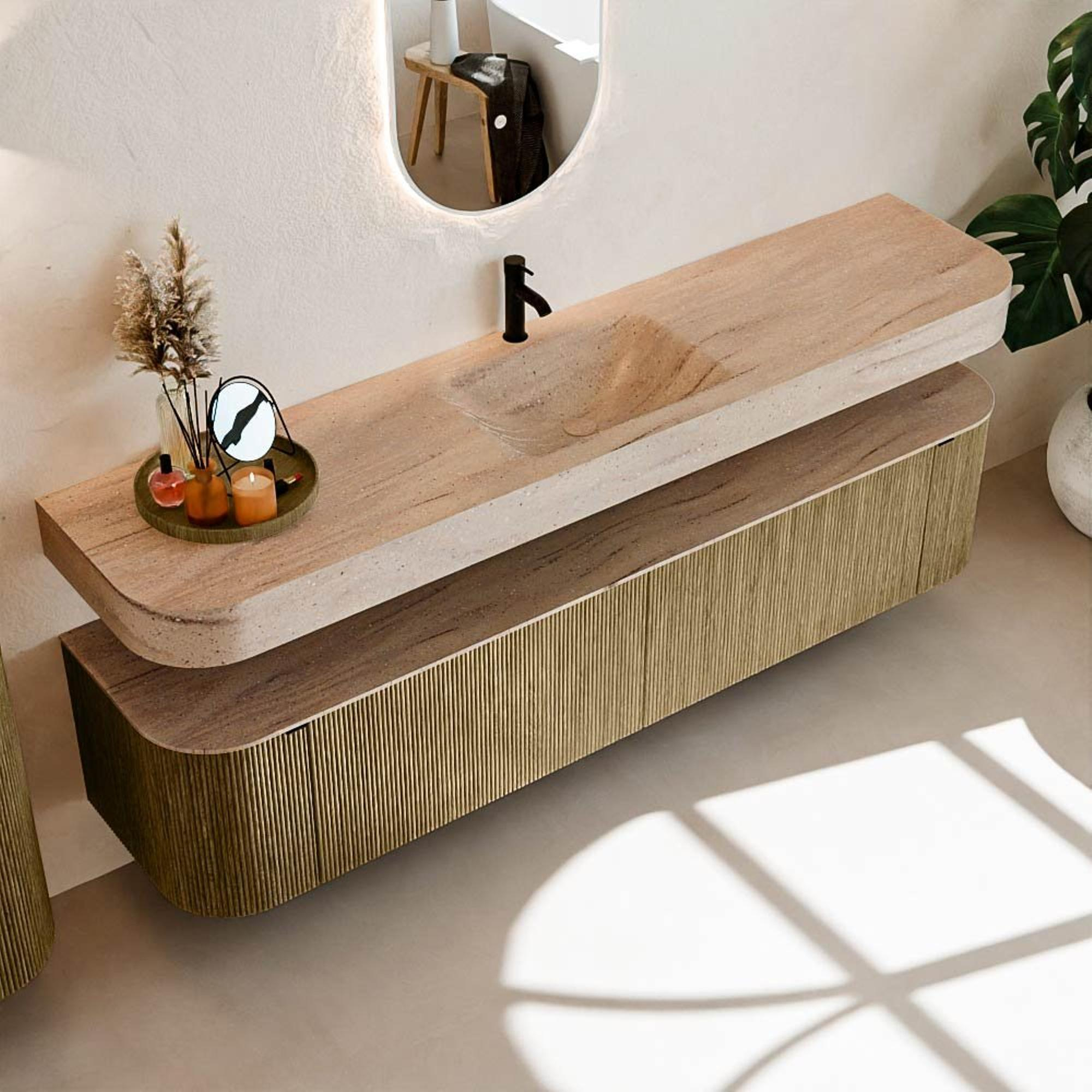 Matériaux naturels dans des tons chauds. Les cannelures verticales apportent rythme et texture au design, tandis que le chêne confère une apparence chaleureuse et artisanale. Choisissez parmi 5 teintes de bois OAK, WALNUT, DUSK, SHADOW et RUBY, des couleurs de bois soigneusement sélectionnées pour enrichir les salles de bains modernes et classiques.