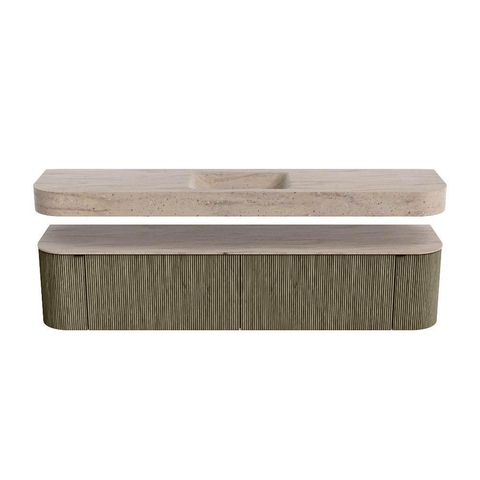 Un lavabo suspendu assorti flotte au-dessus du meuble avec des coins arrondis – parfaitement adapté à la forme du meuble. Réalisé en Solid Surface, le lavabo suit subtilement les lignes du meuble inférieur, créant un ensemble harmonieux. Le plan en Solid Surface forme une base robuste et facile à entretenir, complétant ainsi la combinaison.