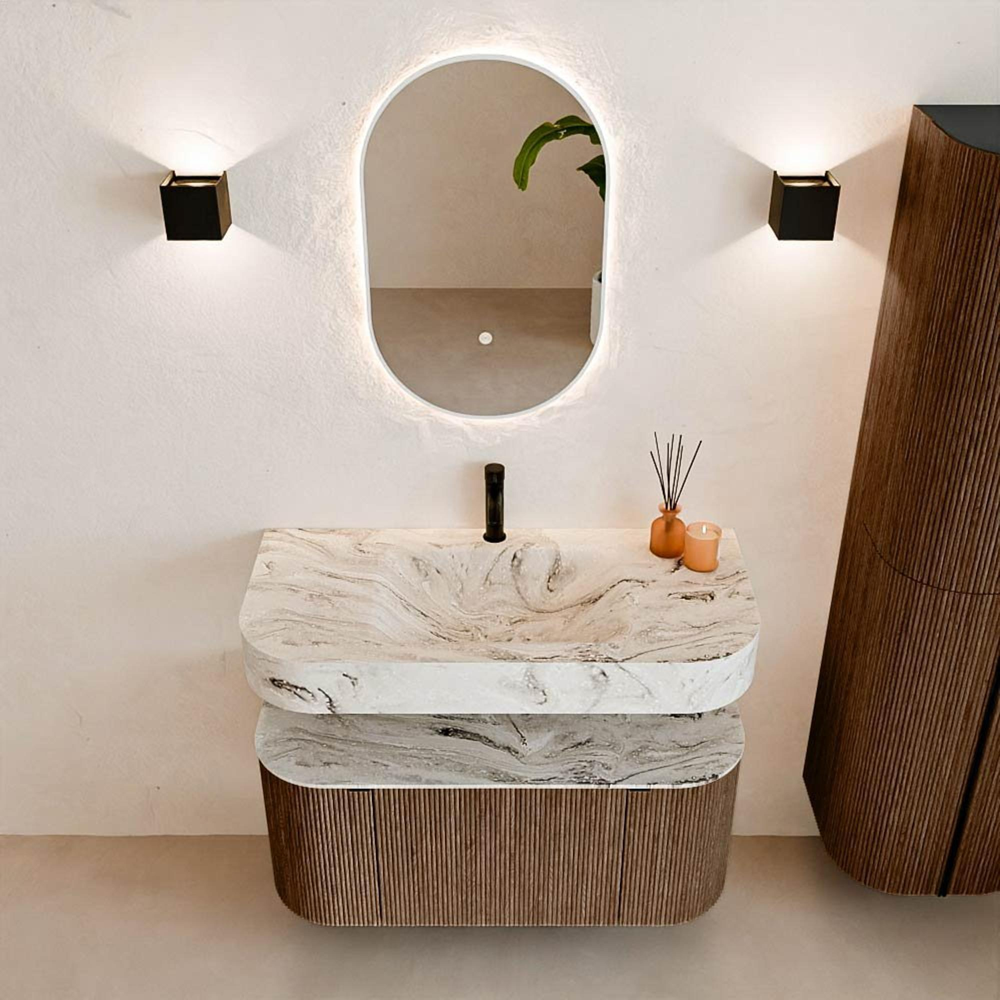 Matériaux naturels aux teintes chaudes. Les cannelures verticales apportent rythme et texture au design, tandis que le chêne confère une apparence chaleureuse et artisanale. Choisissez parmi 5 teintes de bois OAK, WALNUT, DUSK, SHADOW et RUBY, des couleurs de bois soigneusement sélectionnées pour enrichir les salles de bains modernes et classiques.