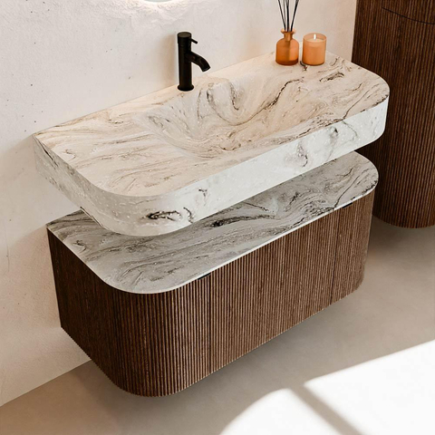 MONDIAZ THOR-DLUX 100cm meuble de salle de bains arrondi gauche + droite couleur Walnut avec 1 tiroir et 2 portes. Vasque suspendue CLOUD Milieu 1 trou de robinet couleur Glace.