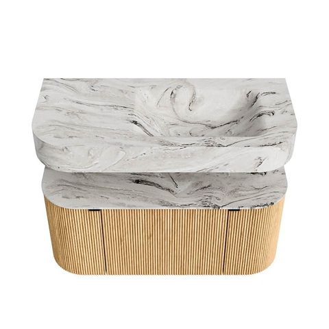 MONDIAZ THOR-DLUX 100cm meuble de salle de bains arrondi gauche + droite couleur Oak avec 1 tiroir et 2 portes. Vasque suspendue CLOUD Droite sans trou de robinet couleur Glace.