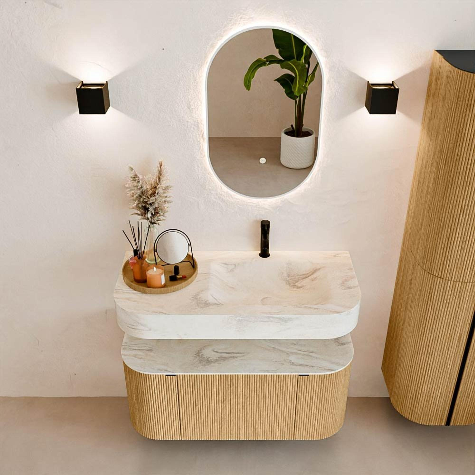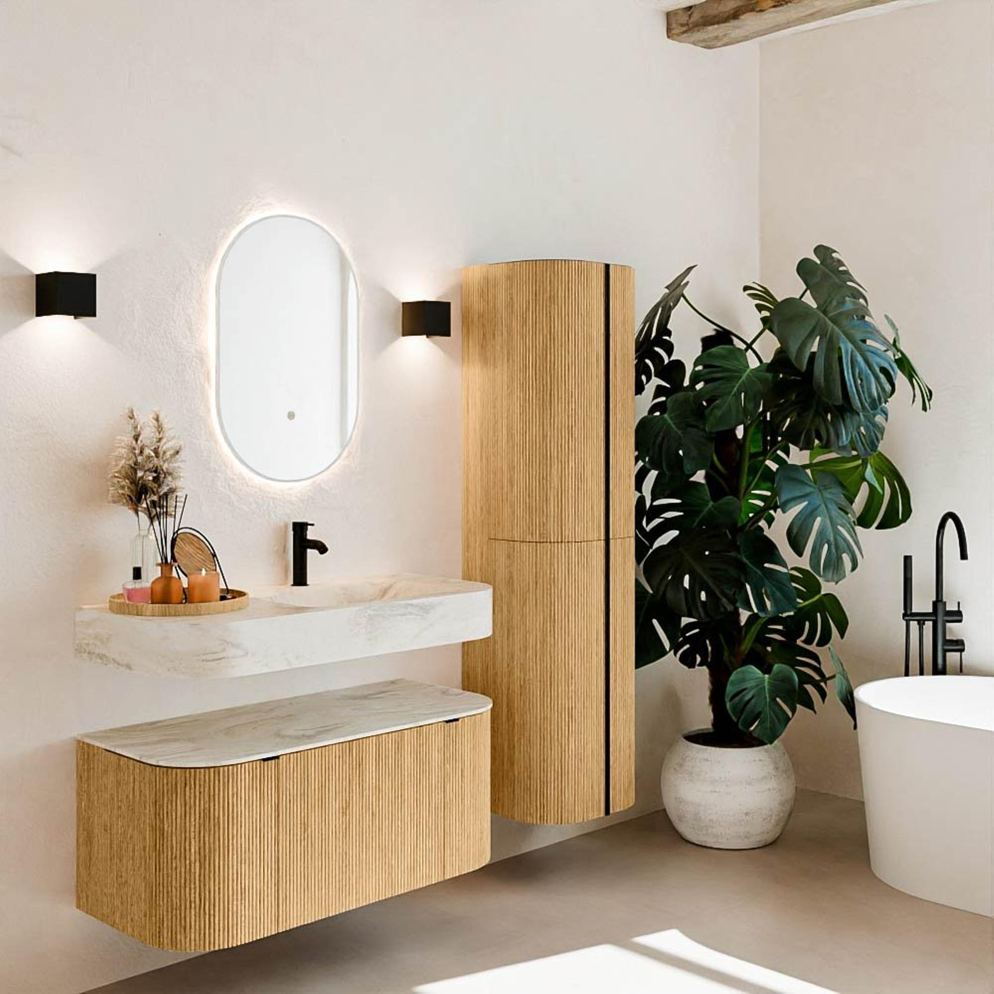 Matériaux naturels aux teintes chaudes. Les cannelures verticales apportent rythme et texture au design, tandis que le chêne confère une apparence chaleureuse et artisanale. Choisissez parmi 5 teintes de bois OAK, WALNUT, DUSK, SHADOW et RUBY, des couleurs de bois soigneusement sélectionnées pour enrichir les salles de bains modernes et classiques.