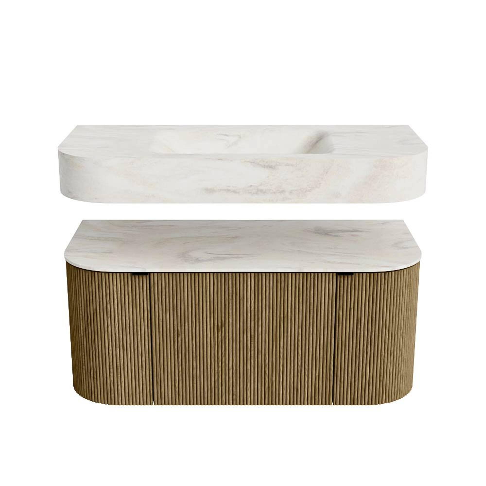 MONDIAZ THOR-DLUX 100cm meuble de salle de bains arrondi gauche + droite couleur Dusk avec 1 tiroir et 2 portes. Vasque suspendue CLOUD Centre sans trou de robinet couleur Ostra.