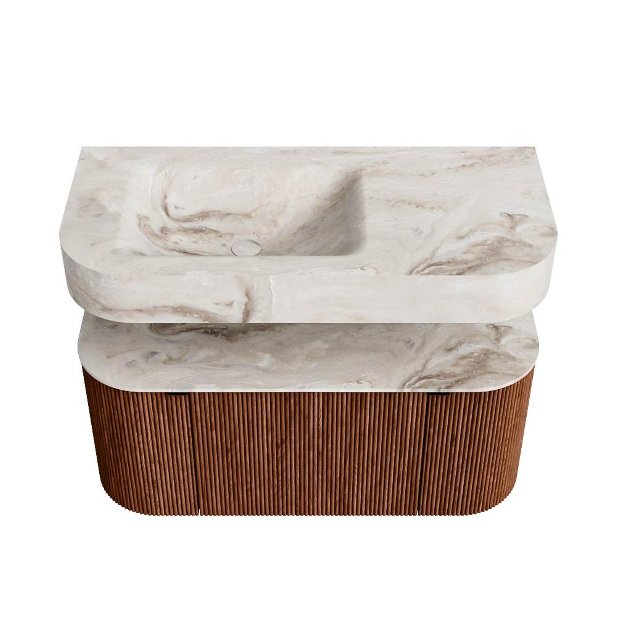 MONDIAZ THOR-DLUX 100cm meuble de salle de bains arrondi gauche + droite couleur Ruby avec 1 tiroir et 2 portes. Vasque suspendue CLOUD Gauche 1 trou de robinet couleur Frappe.