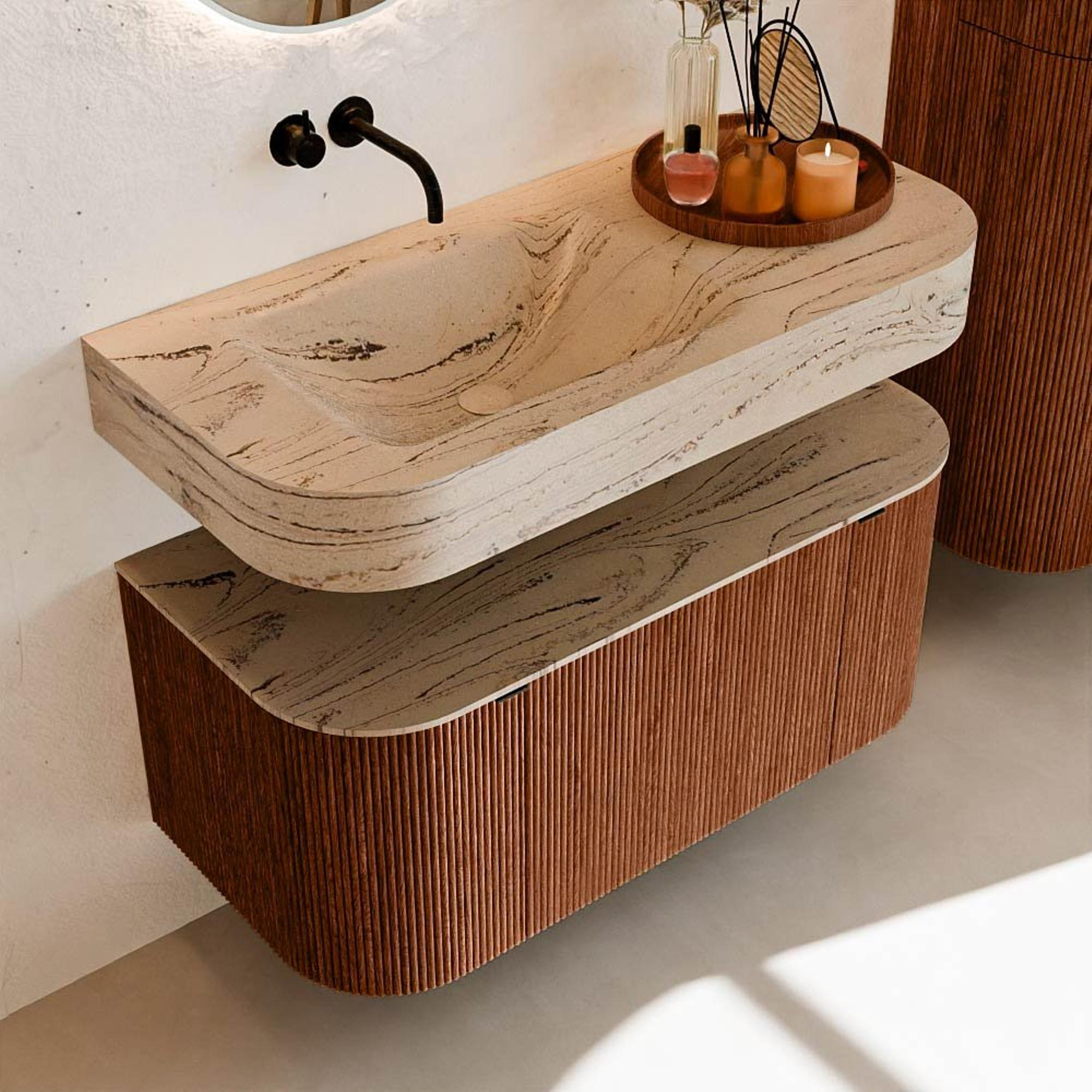 Matériaux naturels dans des tons chauds. Les nervures verticales apportent rythme et texture au design, tandis que le chêne confère une apparence chaleureuse et artisanale. Choisissez parmi 5 teintes de bois OAK, WALNUT, DUSK, SHADOW et RUBY, des couleurs de bois soigneusement sélectionnées pour enrichir les salles de bains modernes et classiques.