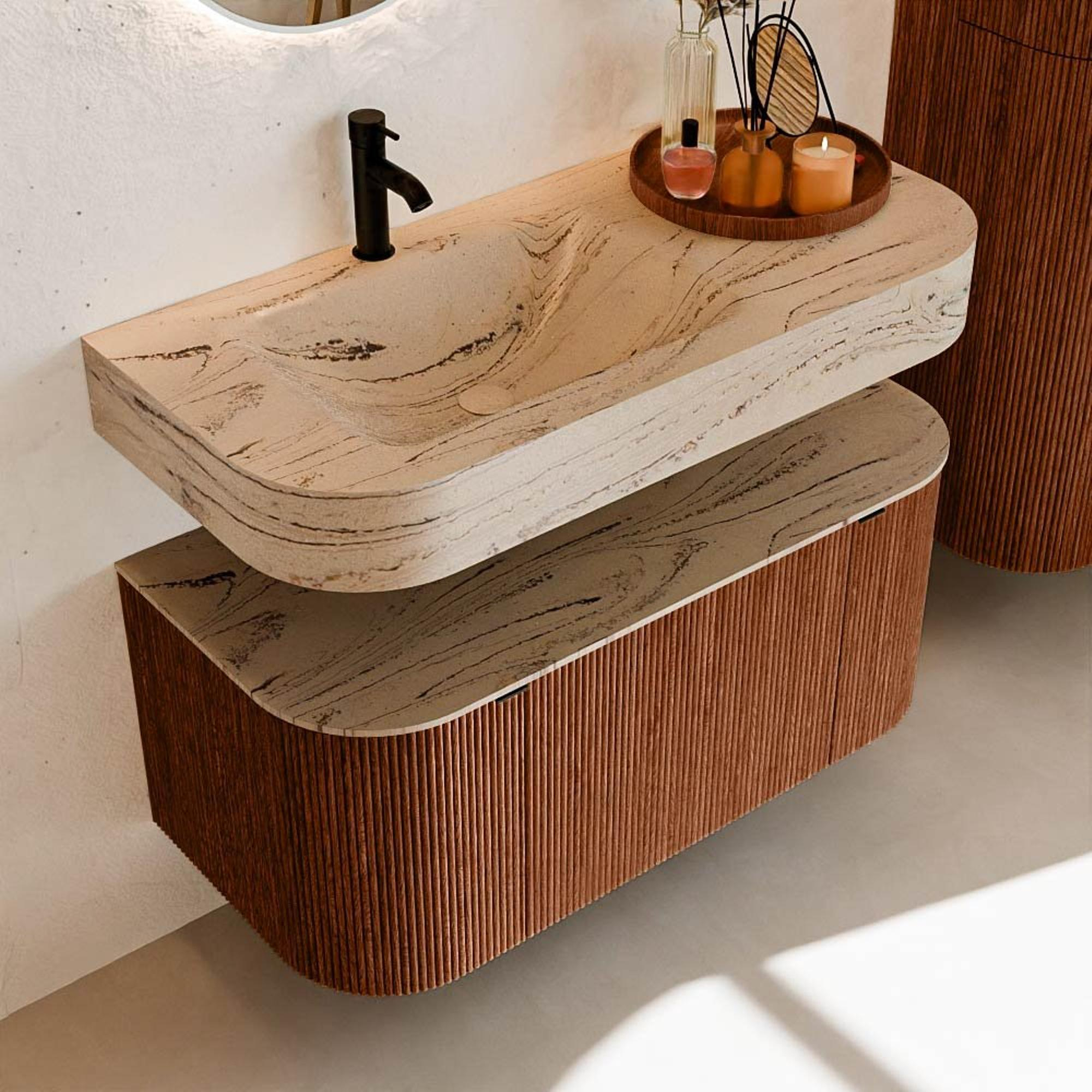 Matériaux naturels dans des tons chauds. Les nervures verticales apportent rythme et texture au design, tandis que le chêne confère une apparence chaleureuse et artisanale. Choisissez parmi 5 teintes de bois OAK, WALNUT, DUSK, SHADOW et RUBY, des couleurs de bois soigneusement sélectionnées pour enrichir les salles de bains modernes et classiques.