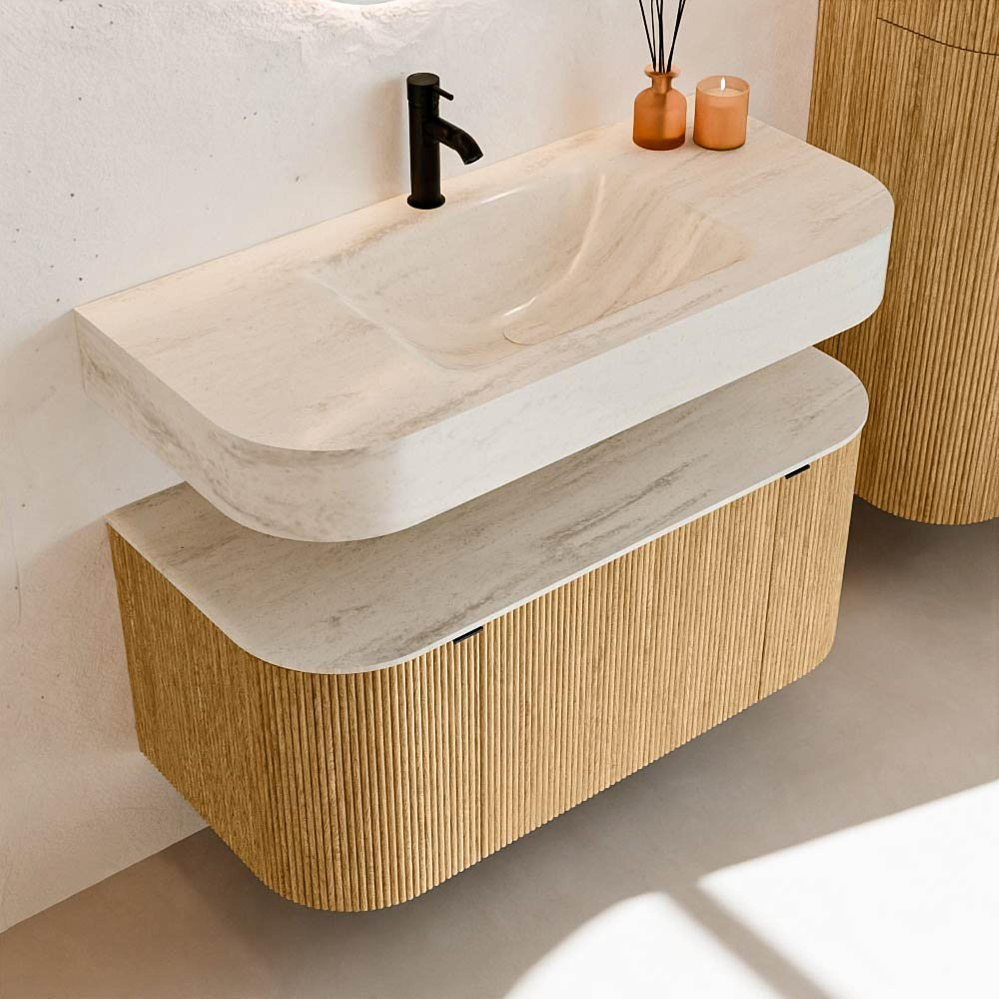 Matériaux naturels dans des tons chauds. Les nervures verticales apportent rythme et texture au design, tandis que le chêne confère une apparence chaleureuse et artisanale. Choisissez parmi 5 teintes de bois Chêne, Noyer, Dusk, Shadow et Ruby, des couleurs de bois soigneusement sélectionnées pour enrichir les salles de bains modernes et classiques.