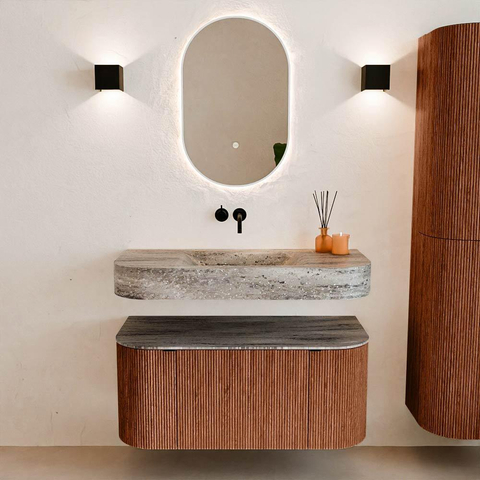 Matériaux naturels dans des tons chauds. Les nervures verticales apportent rythme et texture au design, tandis que le chêne confère une apparence chaleureuse et artisanale. Choisissez parmi 5 teintes de bois OAK, WALNUT, DUSK, SHADOW et RUBY, des couleurs de bois soigneusement sélectionnées pour enrichir les salles de bains modernes et classiques.