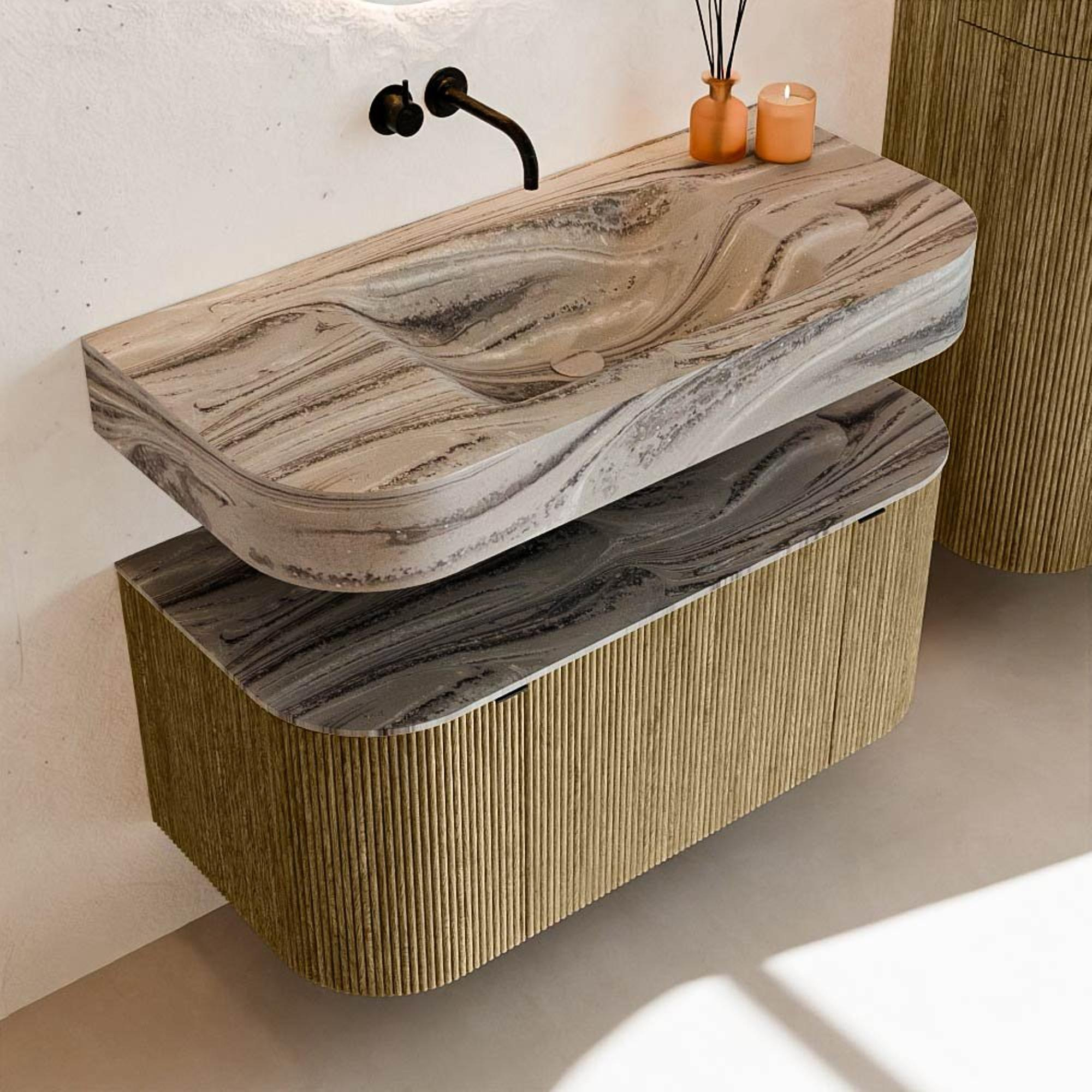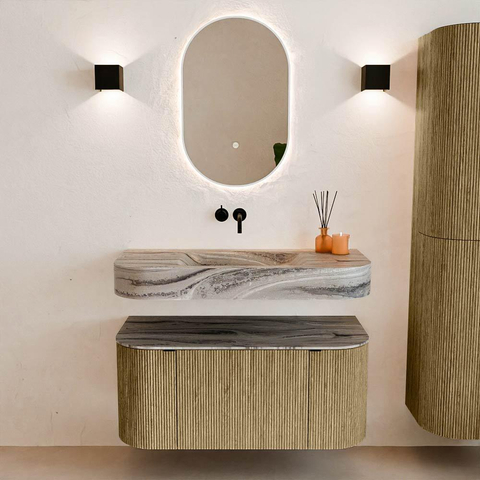 Matériaux naturels dans des tons chauds. Les nervures verticales apportent rythme et texture au design, tandis que le chêne confère une apparence chaleureuse et artisanale. Choisissez parmi 5 teintes de bois OAK, WALNUT, DUSK, SHADOW et RUBY, des couleurs de bois soigneusement sélectionnées pour enrichir les salles de bains modernes et classiques.