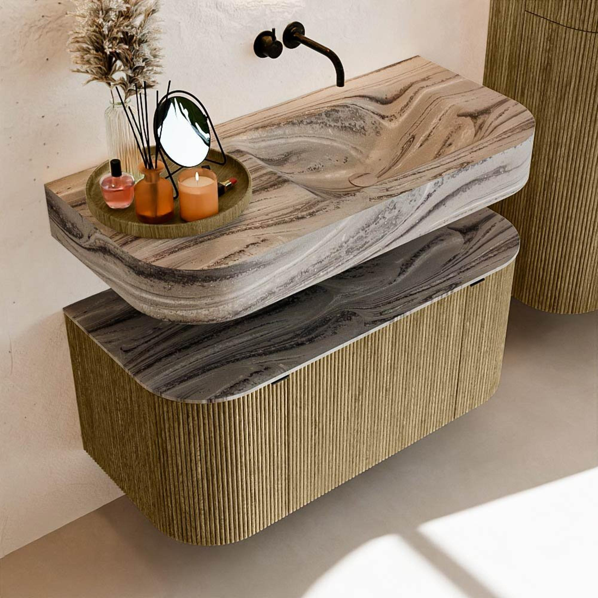 Matériaux naturels dans des tons chauds. Les nervures verticales apportent rythme et texture au design, tandis que le chêne confère une apparence chaleureuse et artisanale. Choisissez parmi 5 teintes de bois OAK, WALNUT, DUSK, SHADOW et RUBY, des couleurs de bois soigneusement sélectionnées pour enrichir les salles de bains modernes et classiques.