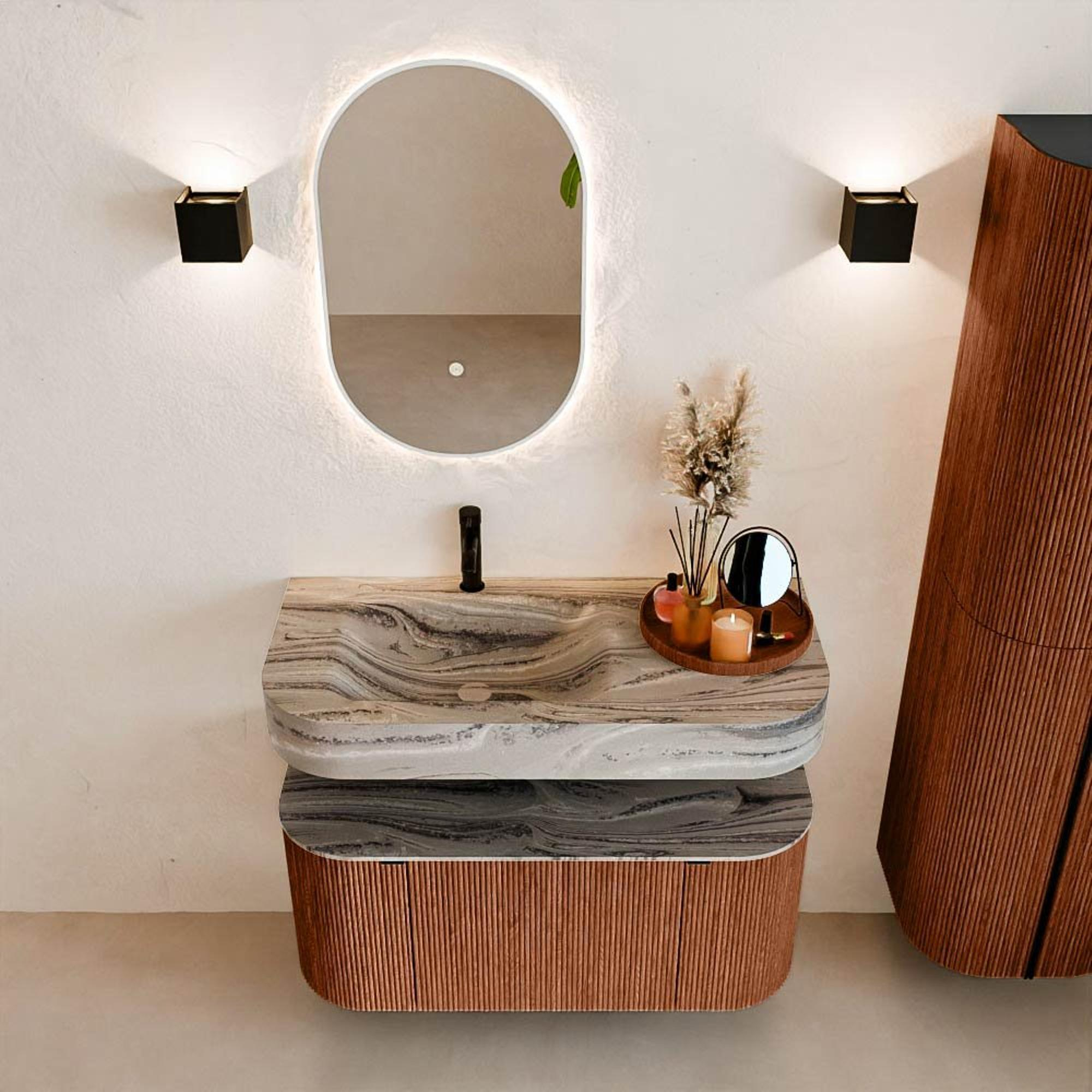 Matériaux naturels dans des tons chauds. Les nervures verticales apportent rythme et texture au design, tandis que le chêne confère une apparence chaleureuse et artisanale. Choisissez parmi 5 teintes de bois OAK, WALNUT, DUSK, SHADOW et RUBY, des couleurs de bois soigneusement sélectionnées pour enrichir les salles de bains modernes et classiques.
