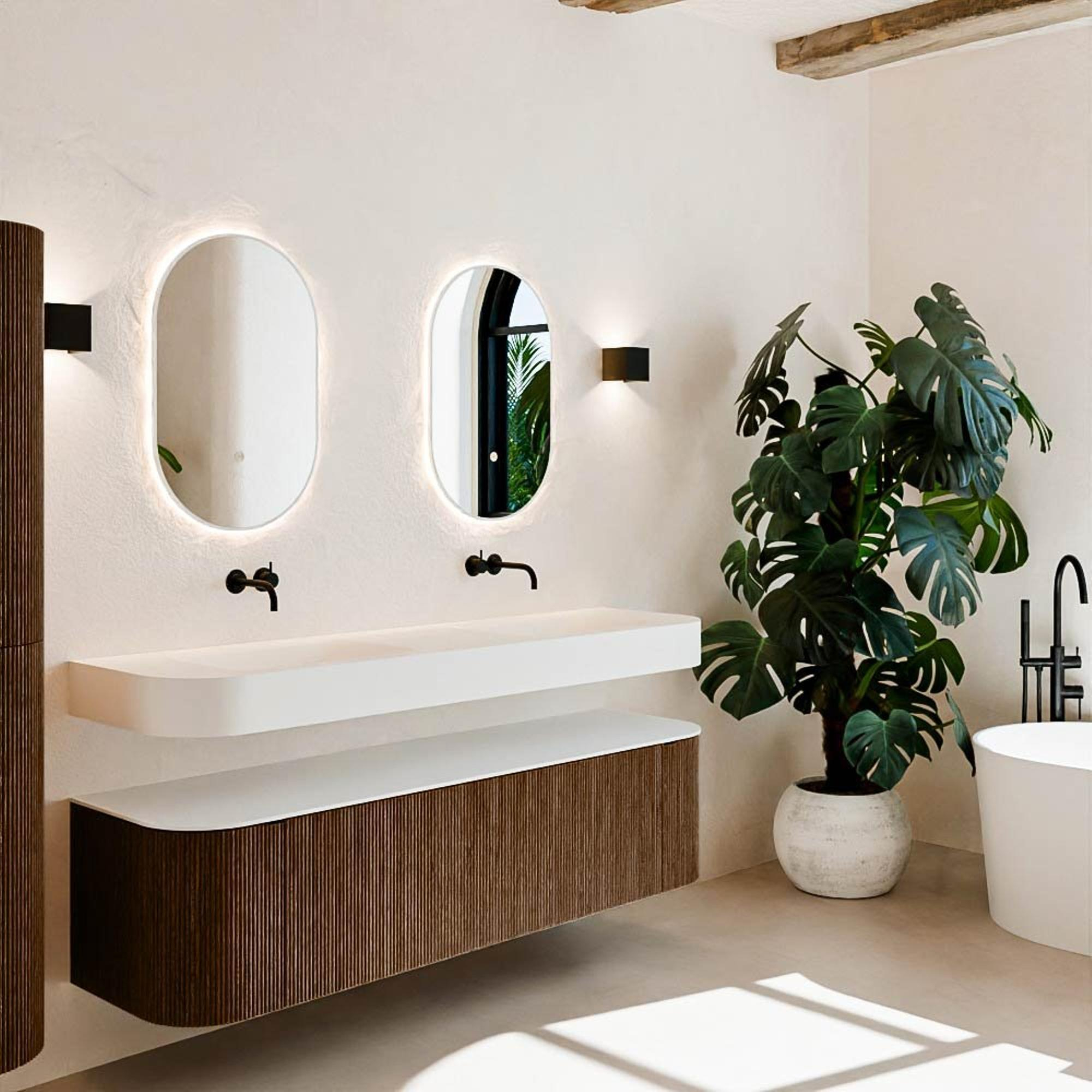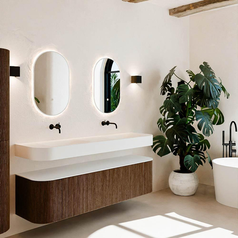 Matériaux naturels dans des tons chauds. Les reliefs verticaux apportent rythme et texture au design, tandis que le chêne confère une apparence chaleureuse et artisanale. Choisissez parmi 5 teintes de bois OAK, WALNUT, DUSK, SHADOW et RUBY, des couleurs de bois soigneusement sélectionnées pour enrichir les salles de bains modernes et classiques.