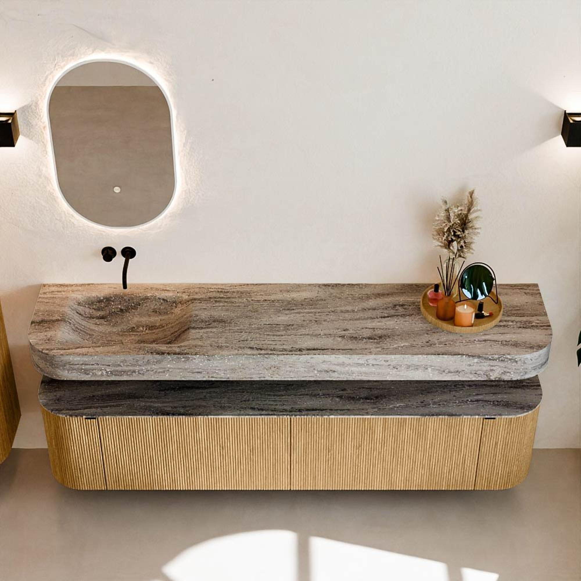 Matériaux naturels dans des tons chauds. Les cannelures verticales apportent rythme et texture au design, tandis que le chêne confère une apparence chaleureuse et artisanale. Choisissez parmi 5 teintes de bois OAK, WALNUT, DUSK, SHADOW et RUBY, des couleurs de bois soigneusement sélectionnées pour enrichir les salles de bains modernes et classiques.