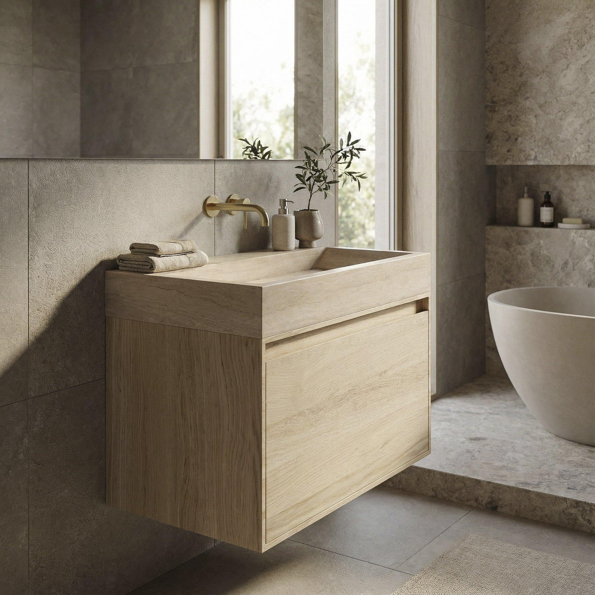Cet ensemble est conçu avec une attention particulière à la durabilité et à la stabilité. Le travertin comme le chêne proviennent d’Europe et sont sélectionnés pour leur qualité, afin que vous puissiez compter sur une base solide pour un usage quotidien intensif. La construction en chêne massif est spécialement développée pour une utilisation dans la salle de bains, en tenant compte du travail naturel du bois. En combinaison avec le jeu de consoles fourni, on obtient un meuble suspendu stable qui peut supporter de manière fiable le poids du lavabo en pierre naturelle. La conception technique est basée sur une capacité de charge indicative d’environ 80 kg pour cette dimension, à condition que la construction du mur y soit adaptée. Si vous préférez confier le montage à un professionnel, vous avez la certitude que le meuble sera fixé en toute sécurité et parfaitement de niveau au mur.