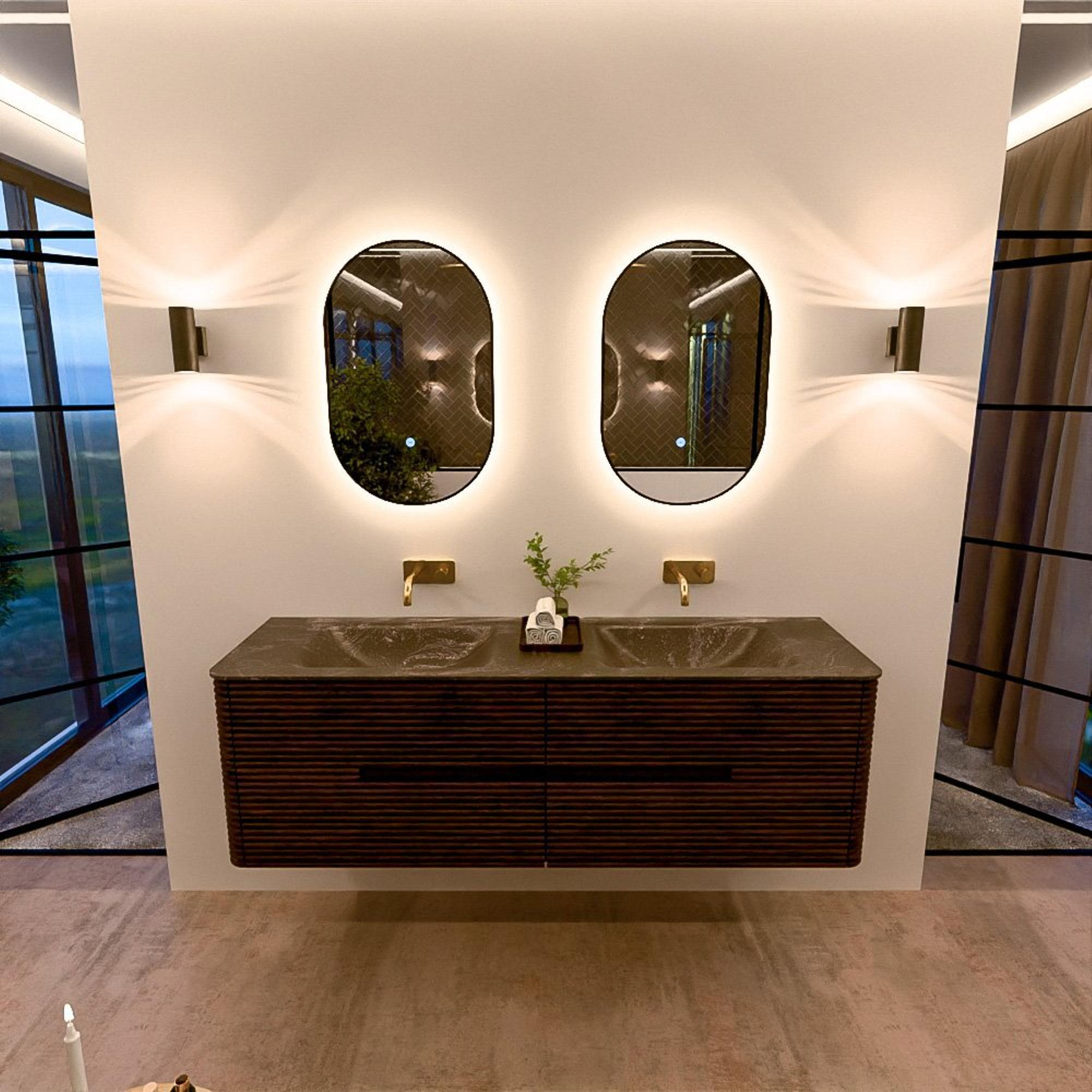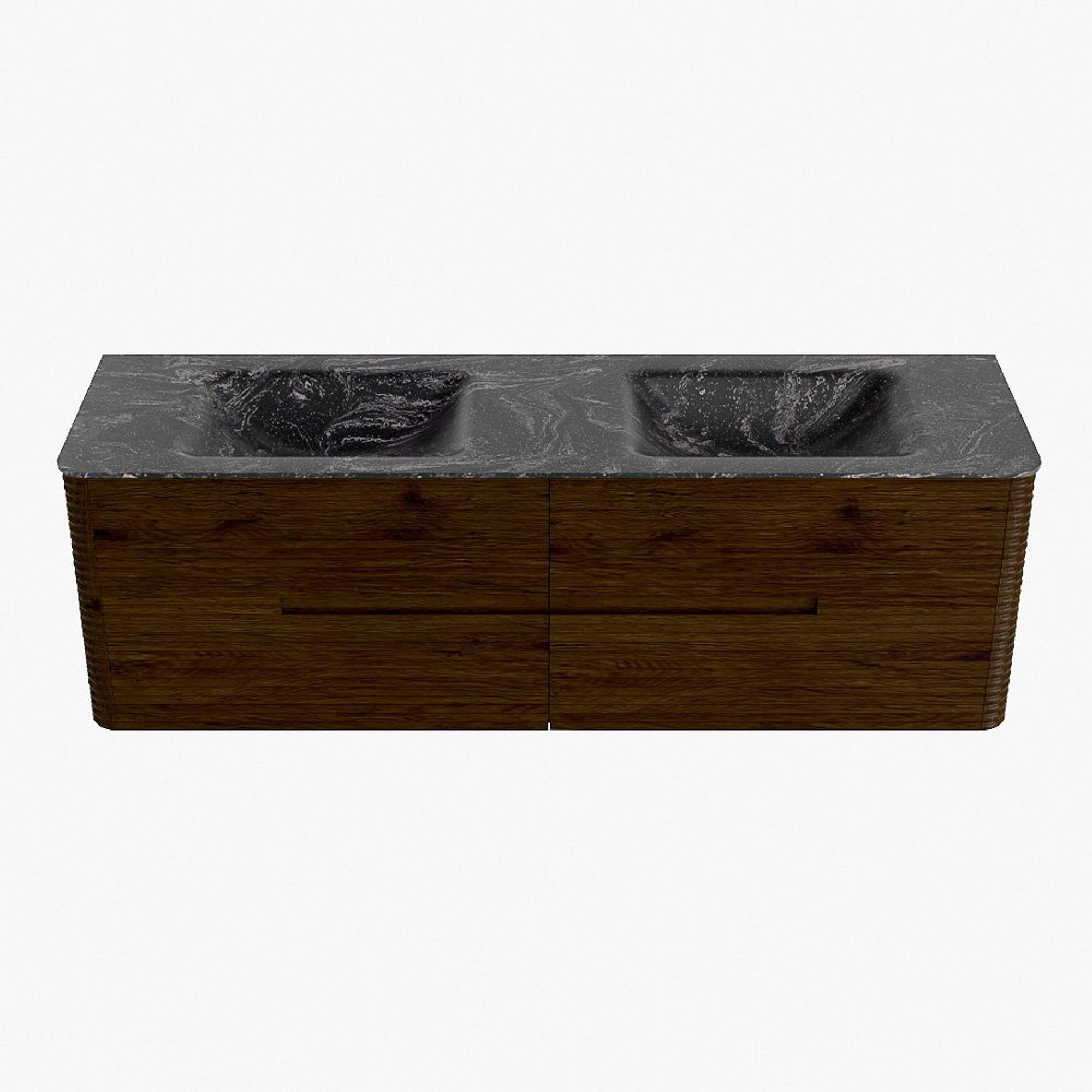 Mondiaz CIRO-DLUX Meuble de salle de bains - 160x45x50cm - Plan-vasque solid surface Lava - 2 vasques double - sans trous de robinetterie - 4 tiroirs - Noyer