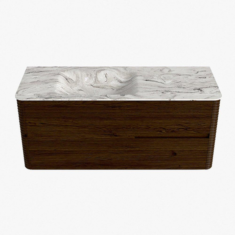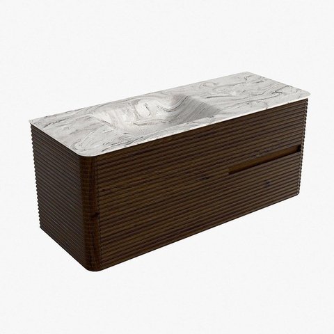 Mondiaz CIRO-DLUX Meuble de salle de bains - 120x45x50cm - plan vasque en solid surface Glace - 1 lavabo à gauche - sans trous de robinetterie - 2 tiroirs - Noyer