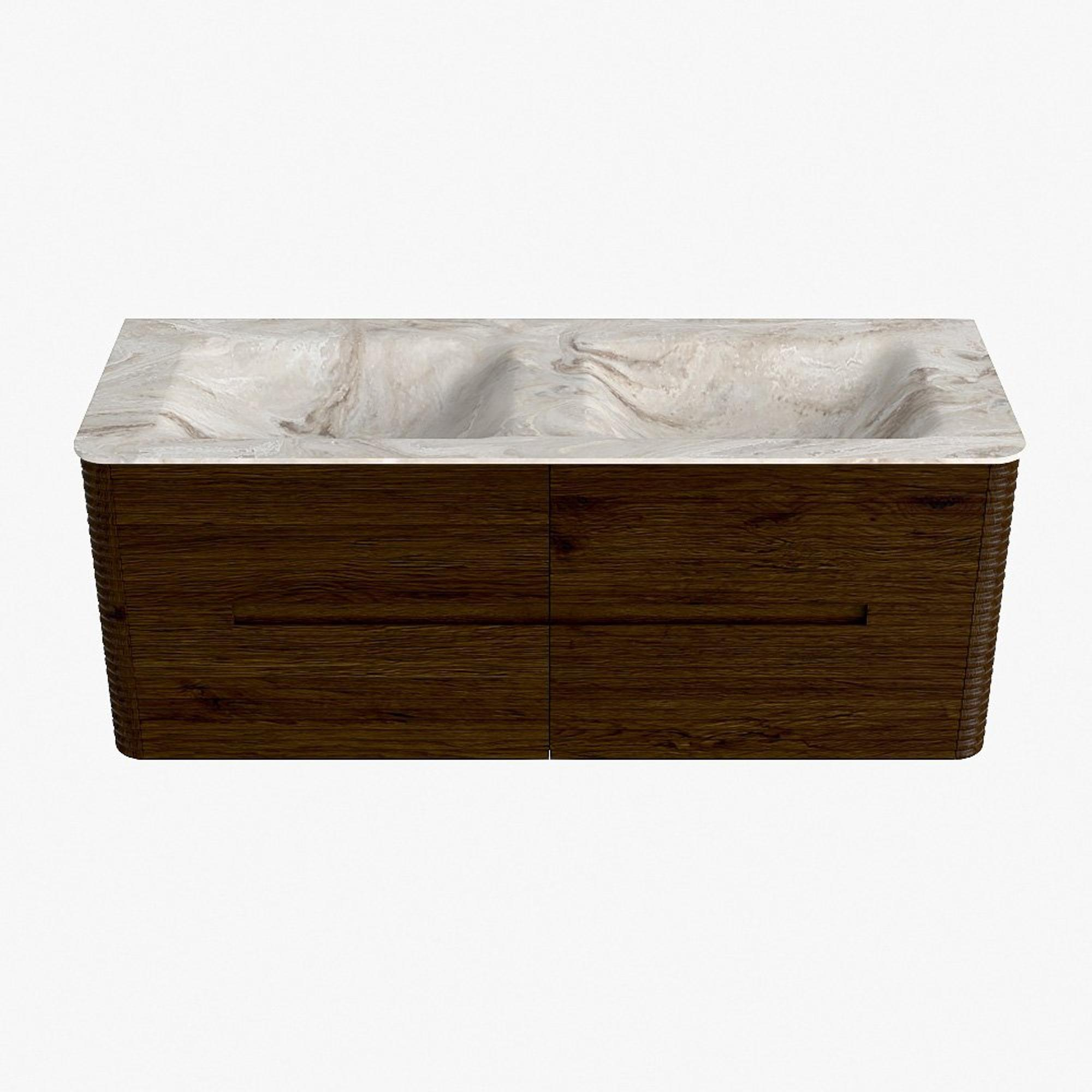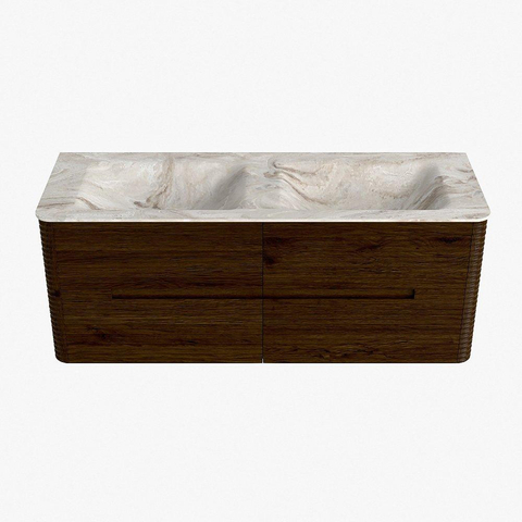 Mondiaz CIRO-DLUX Meuble de salle de bains - 130x45x50cm - Plan vasque solid surface Frappe - 2 vasques double - 2 trous de robinetterie - 4 tiroirs - Noyer