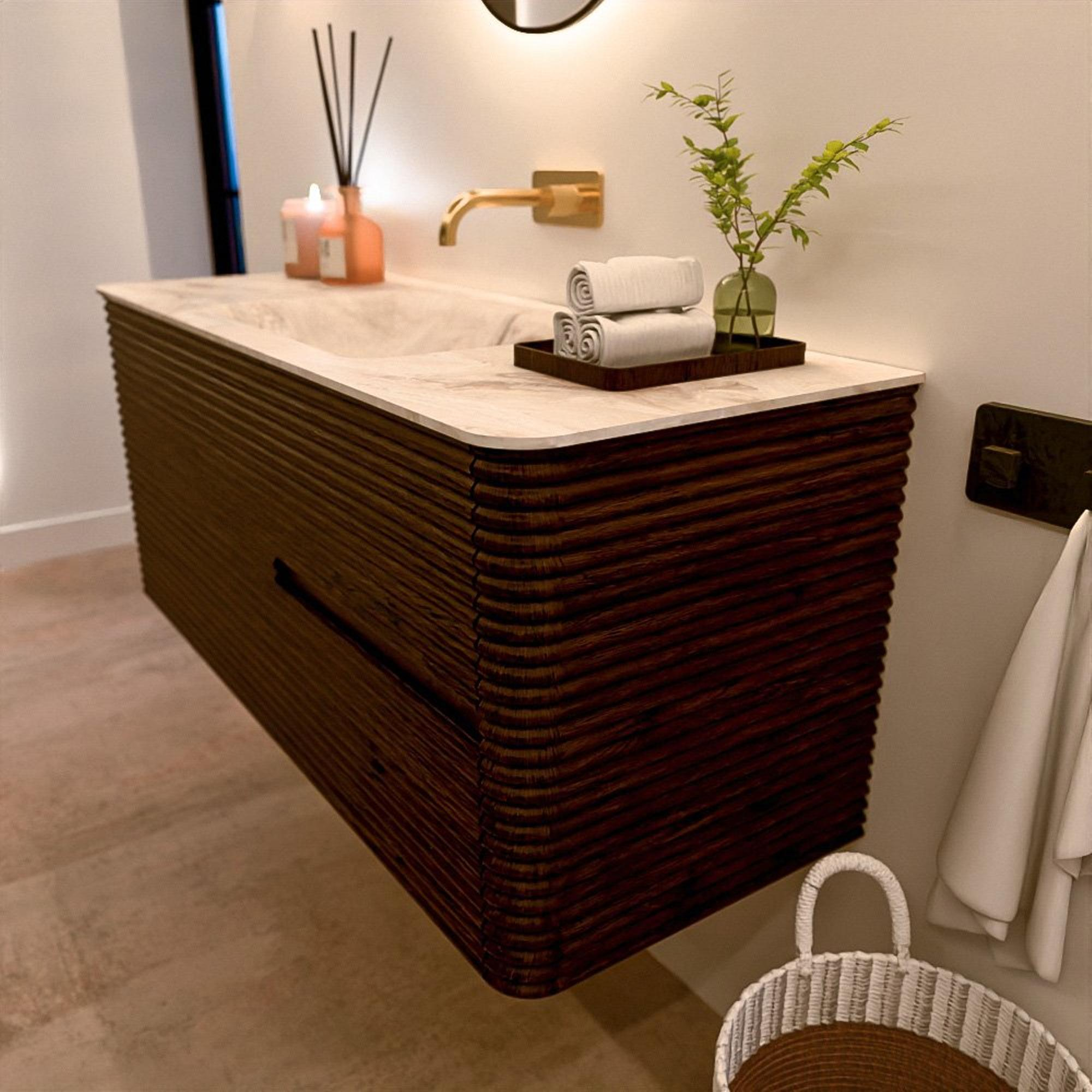 Mondiaz CIRO-DLUX Ensemble de meubles de salle de bains - 120x45x50cm - Vasque en solid surface Frappe - 1 bassin au milieu - sans trous de robinet - 2 tiroirs - Noyer