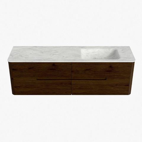 Mondiaz CIRO-DLUX Meuble de salle de bains ensemble - 160x45x50cm - plan vasque Solid surface Opalo - 1 lavabo à droite - sans trous de robinetterie - 4 tiroirs - Noyer