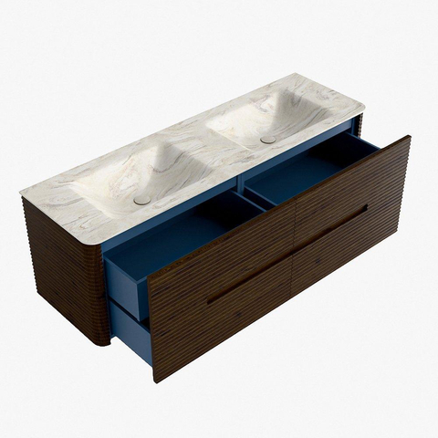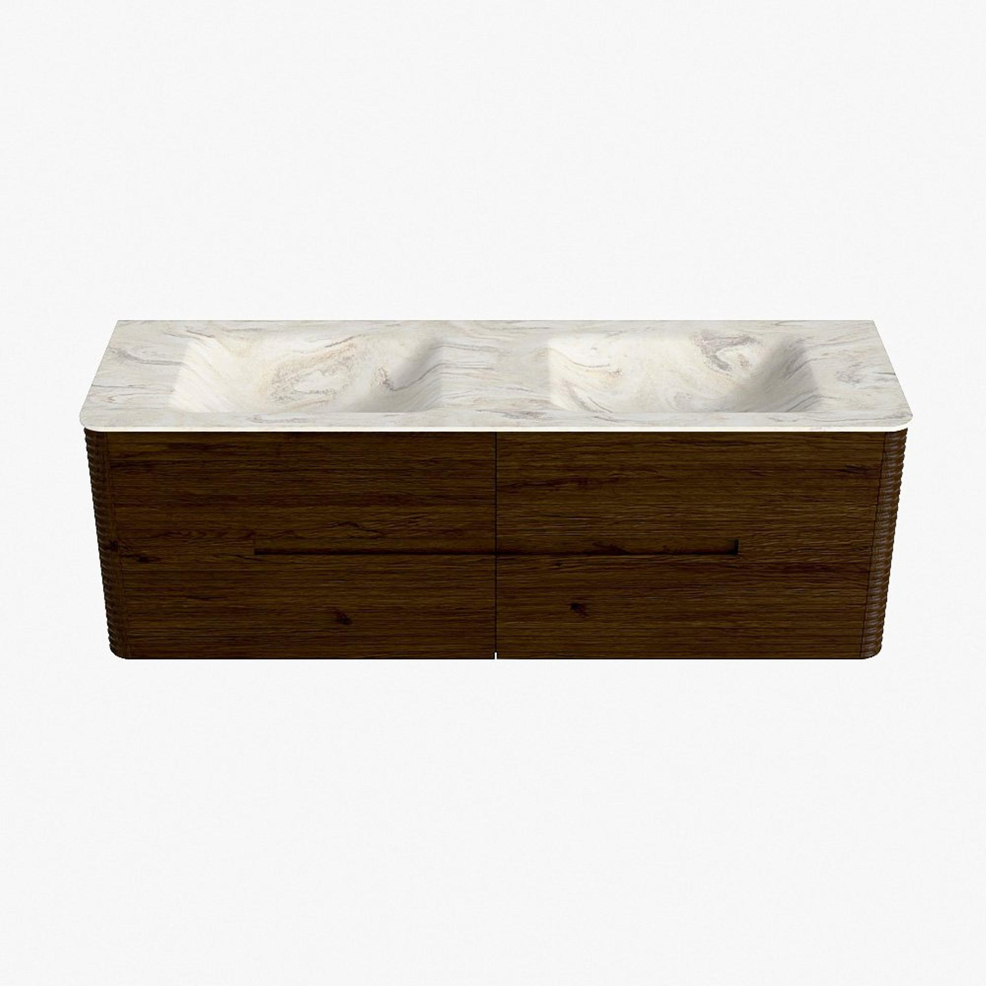 Mondiaz CIRO-DLUX Meuble de salle de bains - 150x45x50cm - Plan vasque solid surface Ostra - 2 vasques Double - sans trous de robinet - 4 tiroirs - Noyer