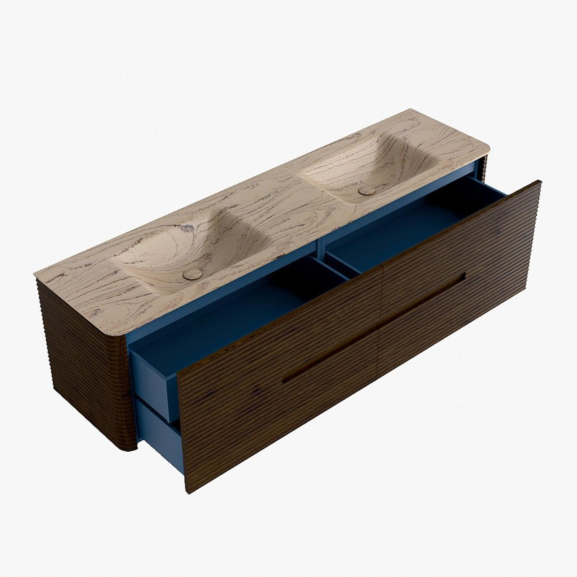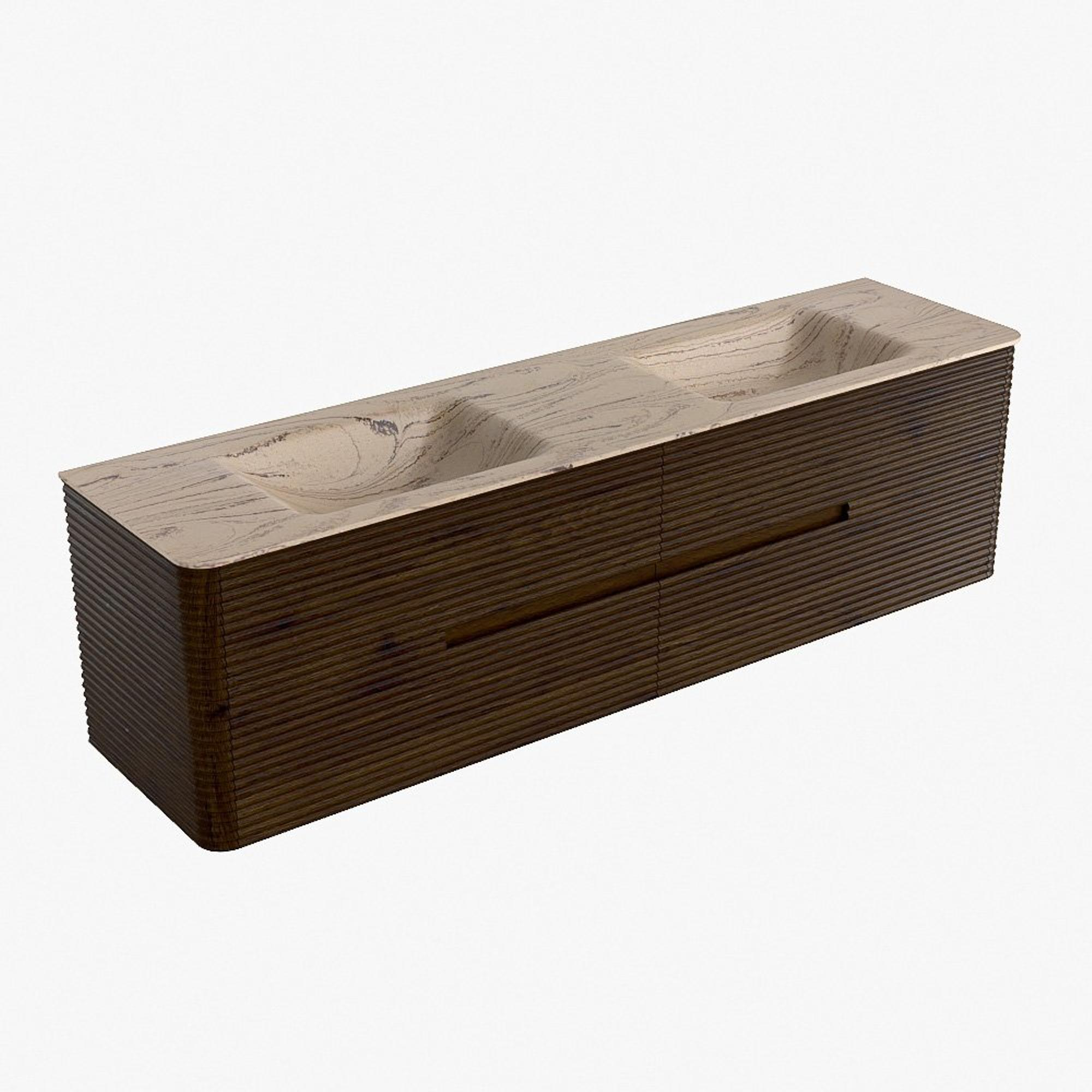 Mondiaz CIRO-DLUX Meuble de salle de bains - 180x45x50cm - plan vasque solid surface Arena - 2 vasques double - sans trous de robinet - 4 tiroirs - Noyer