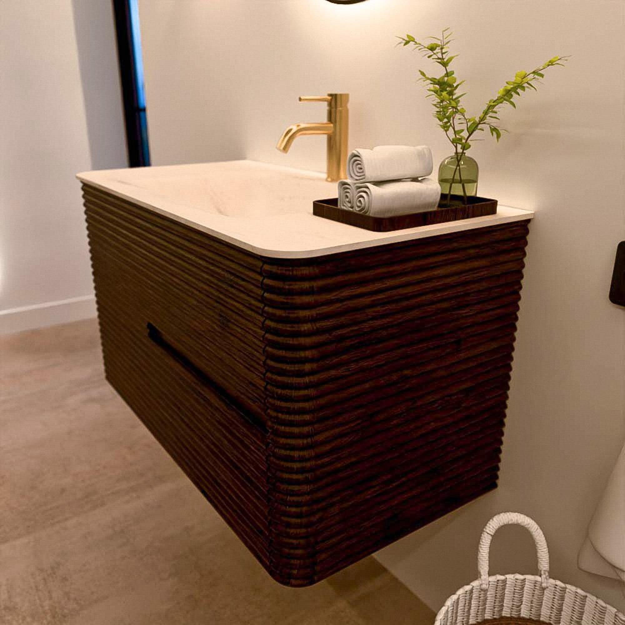 Mondiaz CIRO-DLUX Meuble de salle de bains - 90x45x50cm - Plan-vasque Solid surface Meli - 1 vasque Centrale - 1 trou de robinet - 2 tiroirs - Noyer