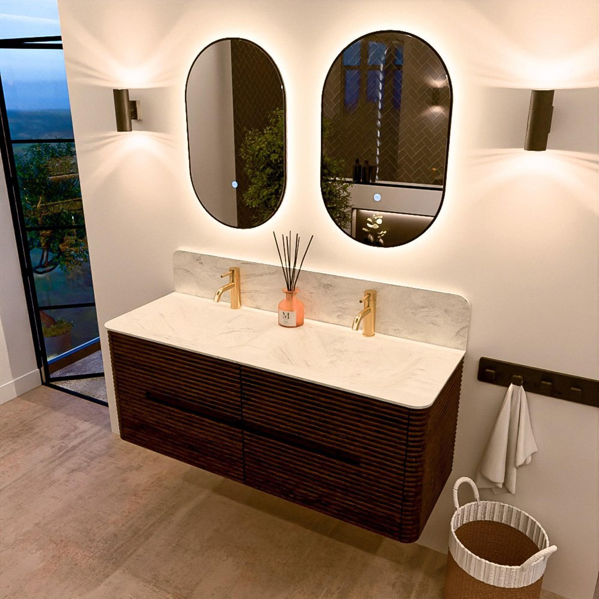 Mondiaz CIRO-DLUX Meuble de salle de bains - 130x45x50cm - plan-vasque solid surface Opalo - 2 vasques double - 2 trous de robinetterie - 4 tiroirs - Noyer