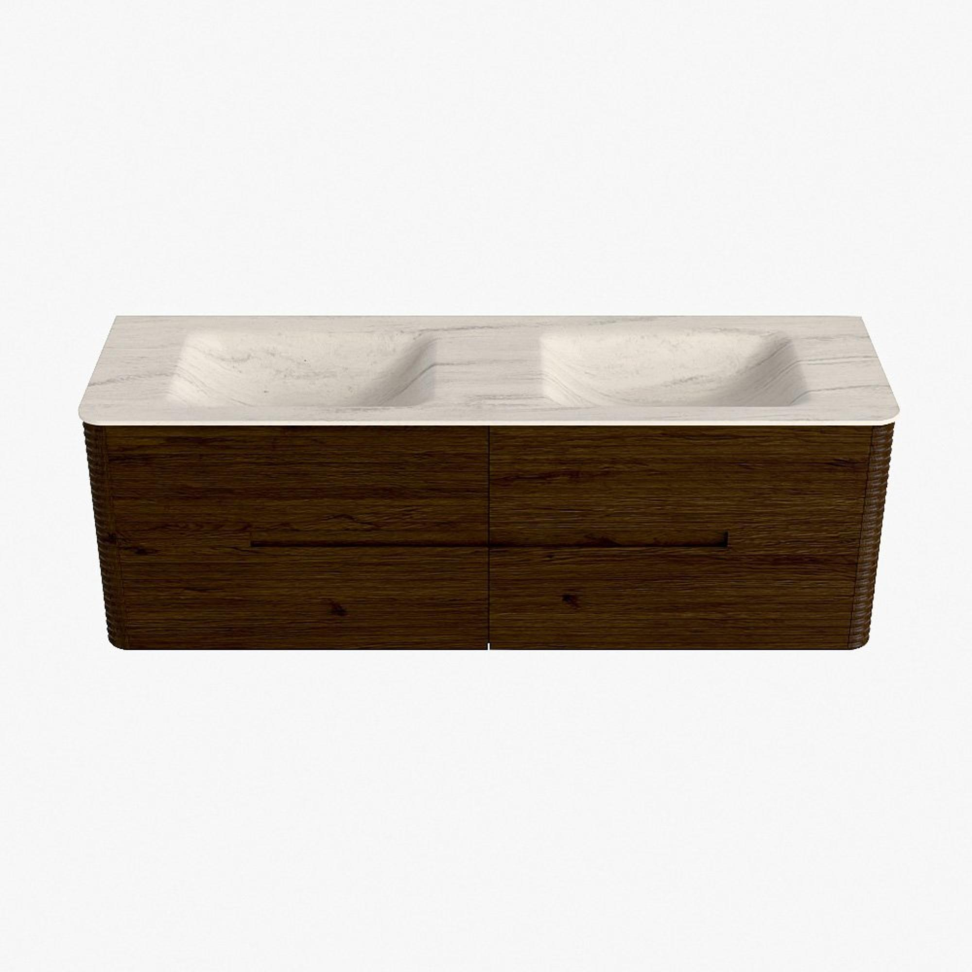 Mondiaz CIRO-DLUX Meuble de salle de bains - 150x45x50cm - Plan vasque Solid surface Meli - 2 bacs Doubles - sans trous de robinet - 4 tiroirs - Noyer