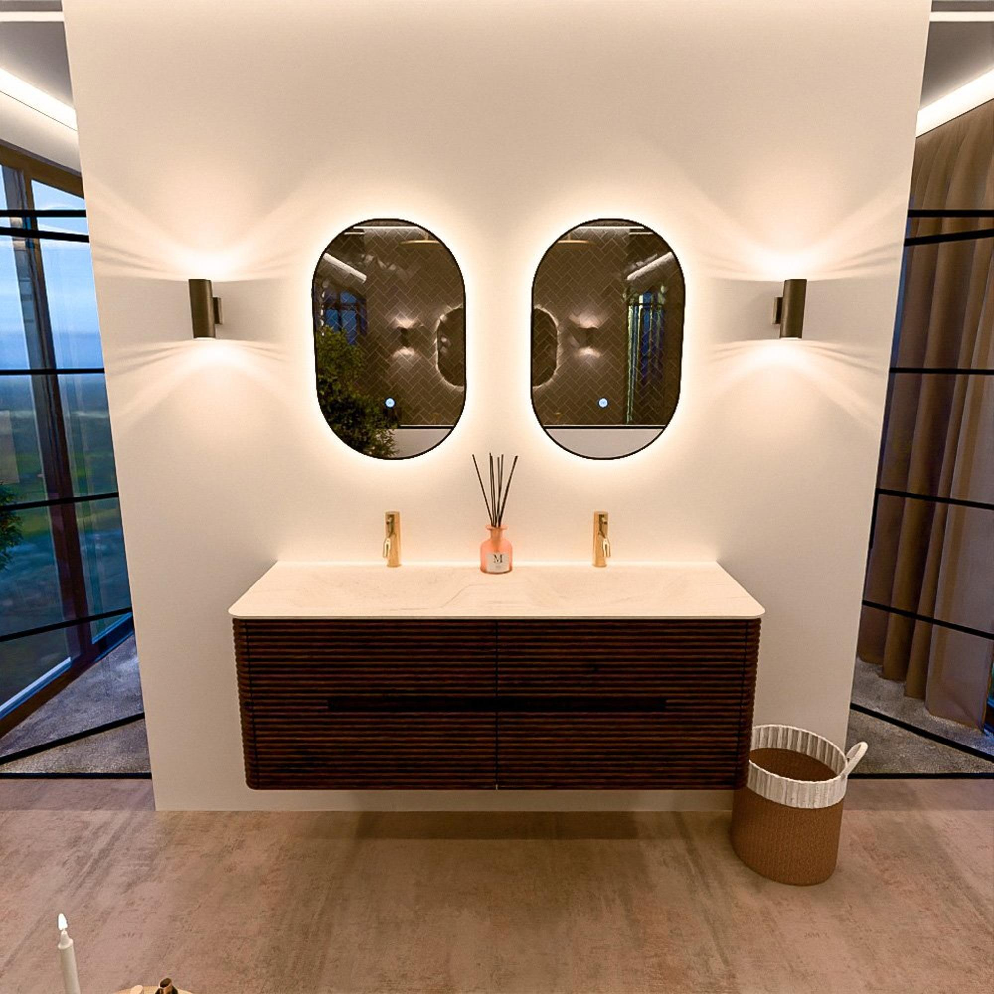 Mondiaz CIRO-DLUX Ensemble meuble de salle de bains - 140x45x50cm - Plan-vasque en solid surface Meli - 2 vasques double - 2 trous de robinetterie - 4 tiroirs - Noyer