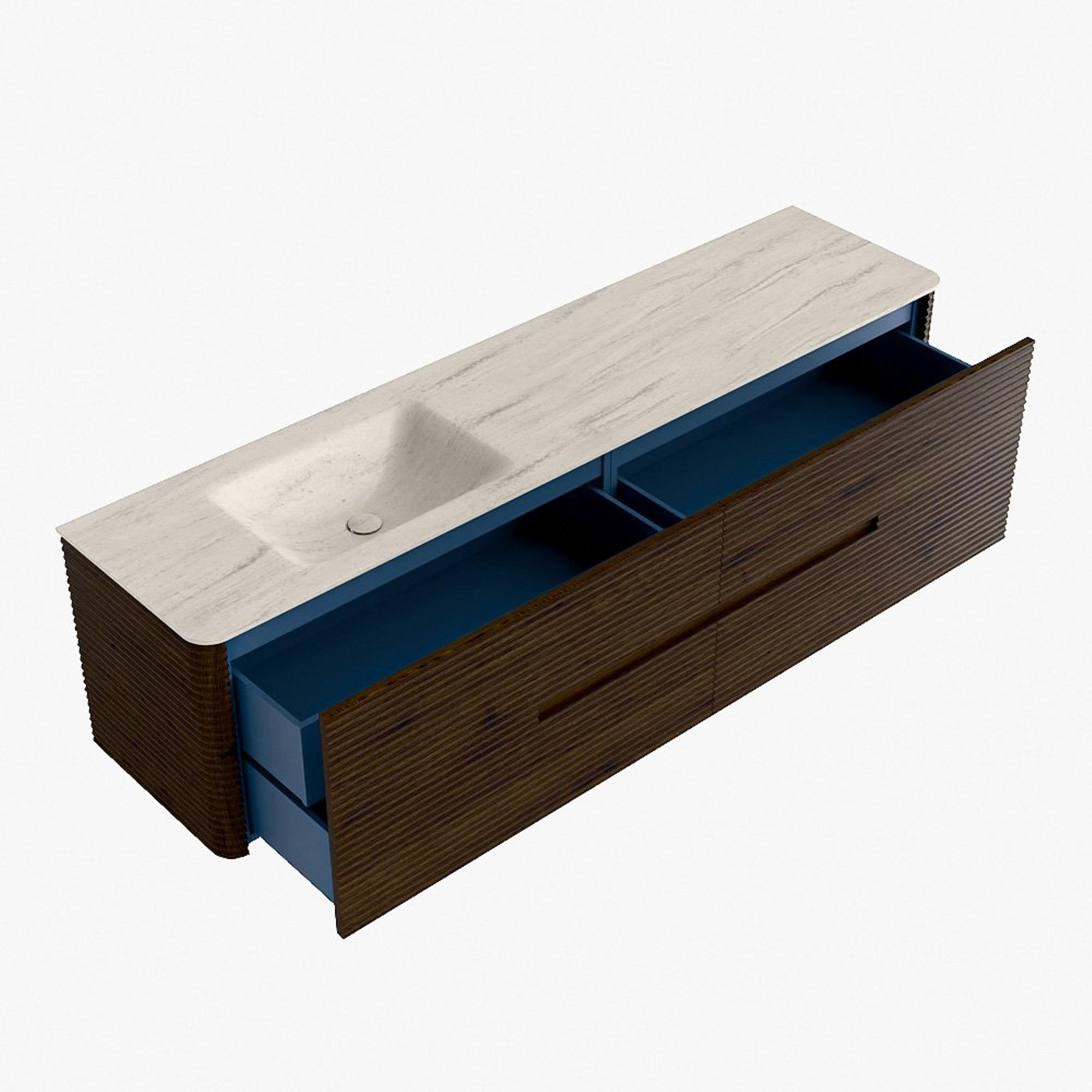 La praticité est un élément essentiel de la gamme CIRO. Le meuble dispose d’un grand tiroir avec un tiroir intérieur supplémentaire, idéal pour ranger de manière organisée tous les articles quotidiens de la salle de bain. Grâce à la poignée intégrée et au mécanisme de fermeture douce, la façade reste sobre, élégante et épurée.