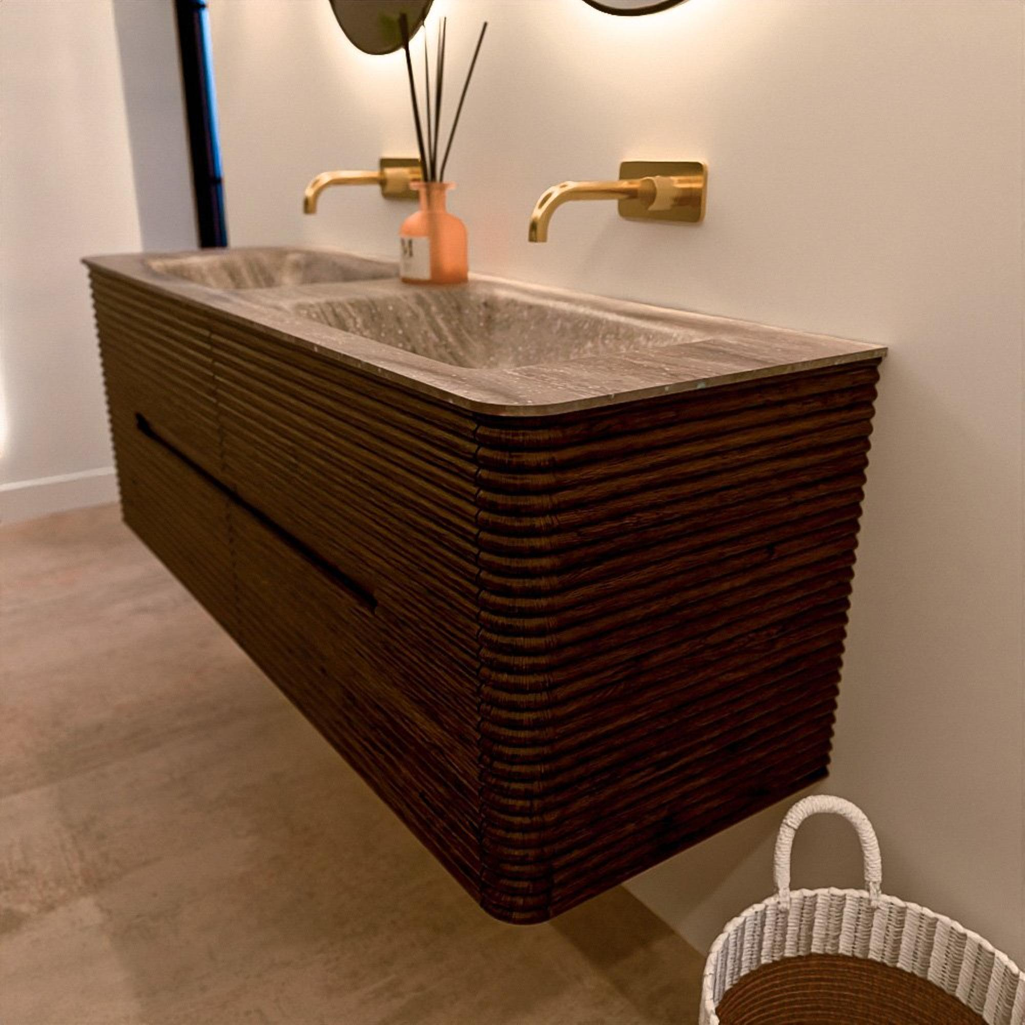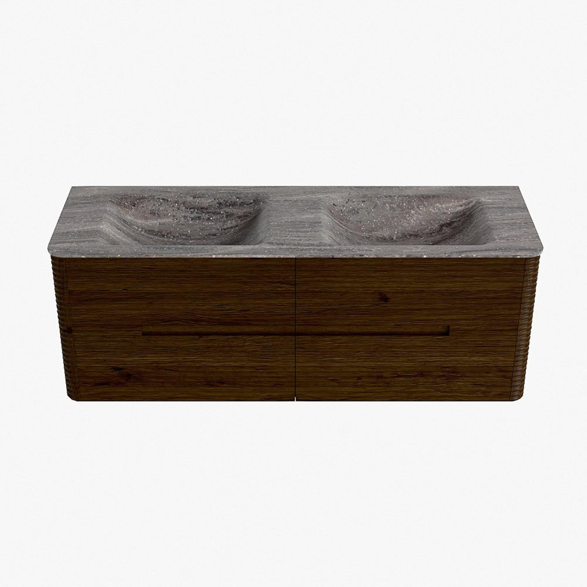 Mondiaz CIRO-DLUX Ensemble de meubles de salle de bains - 140x45x50cm - plan vasque solid surface Oza - 2 vasques Double - sans trous de robinet - 4 tiroirs - Noyer