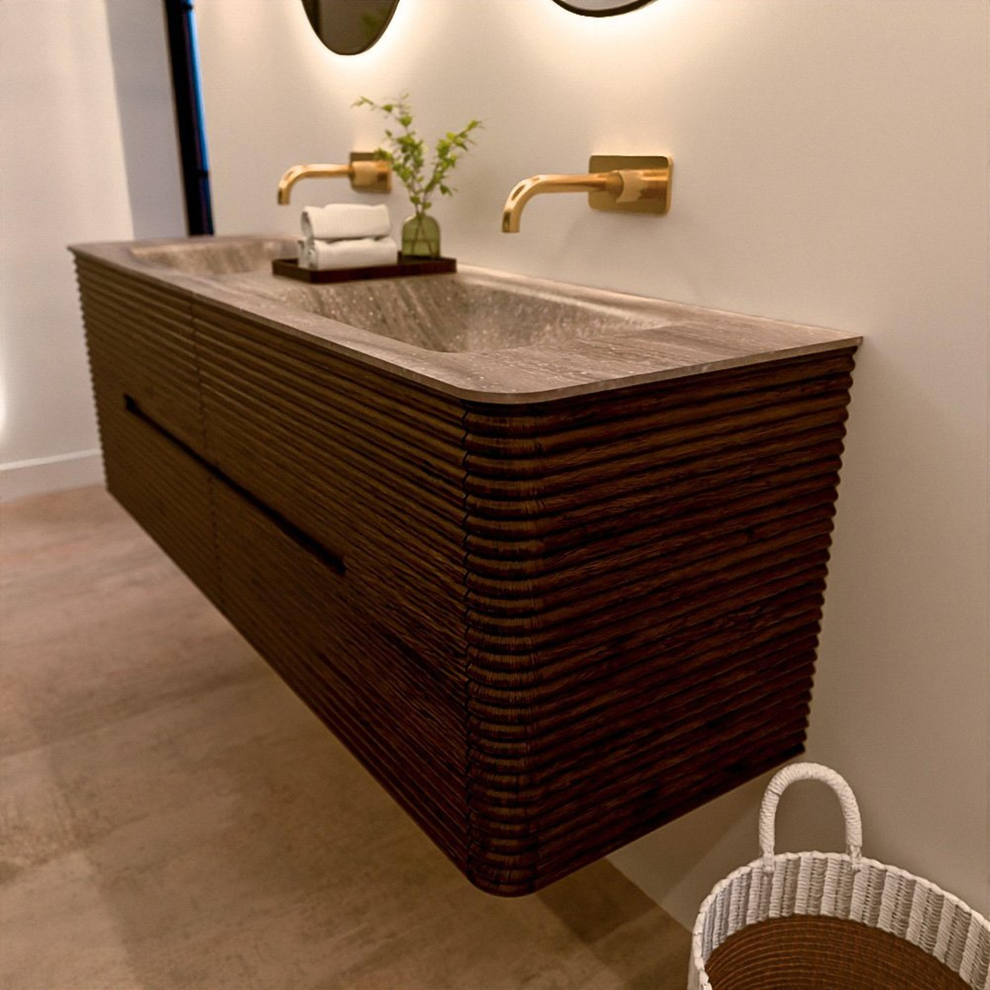 Mondiaz CIRO-DLUX Meuble de salle de bains - 150x45x50cm - plan-vasque Solid Surface Oza - 2 bacs Double - sans trous de robinetterie - 4 tiroirs - Noyer