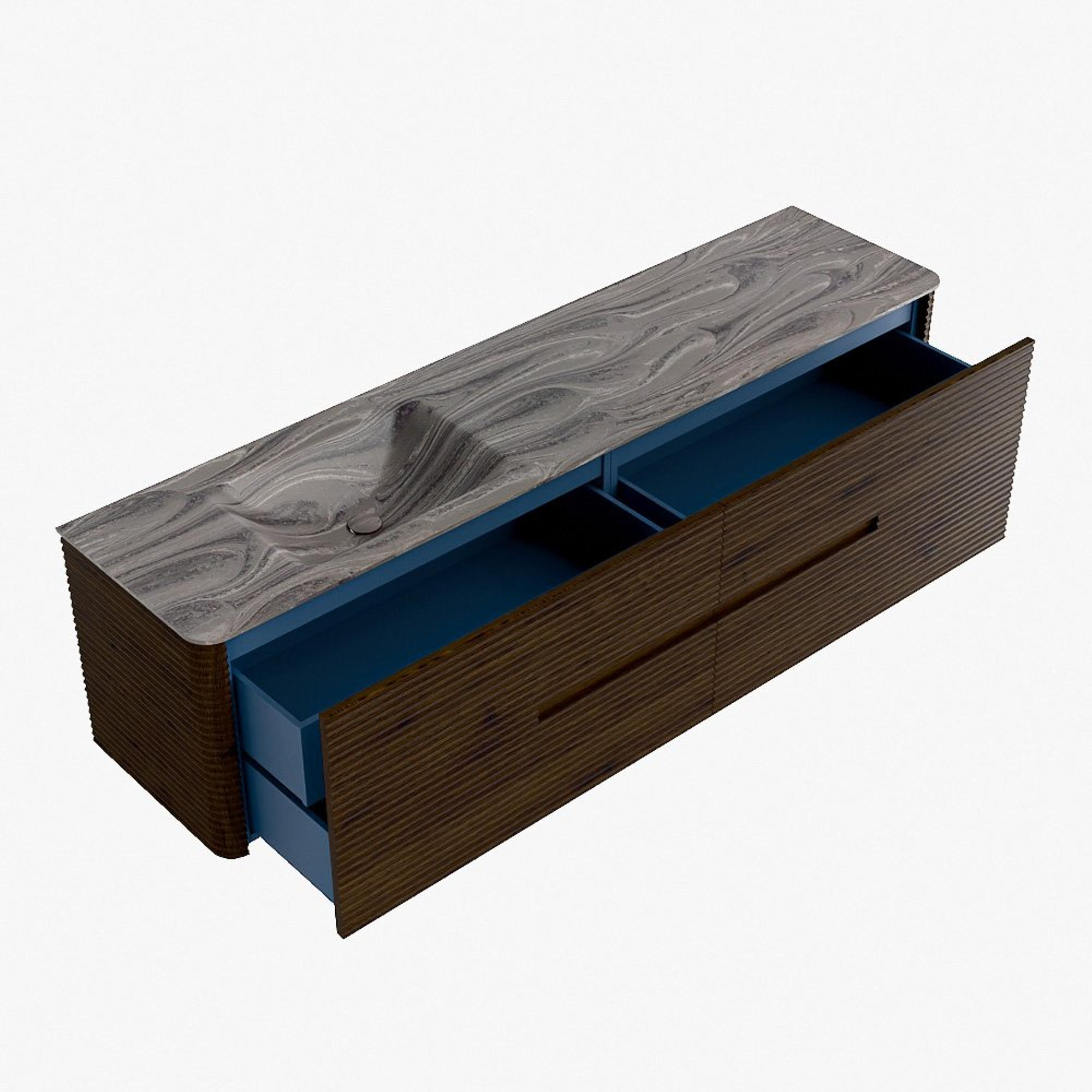 La praticité est un élément essentiel de la gamme CIRO. Le meuble dispose d’un grand tiroir avec un tiroir intérieur supplémentaire, idéal pour ranger de manière organisée tous les articles quotidiens de la salle de bain. Grâce à la poignée intégrée et au mécanisme de fermeture douce, la façade reste sobre, élégante et épurée.