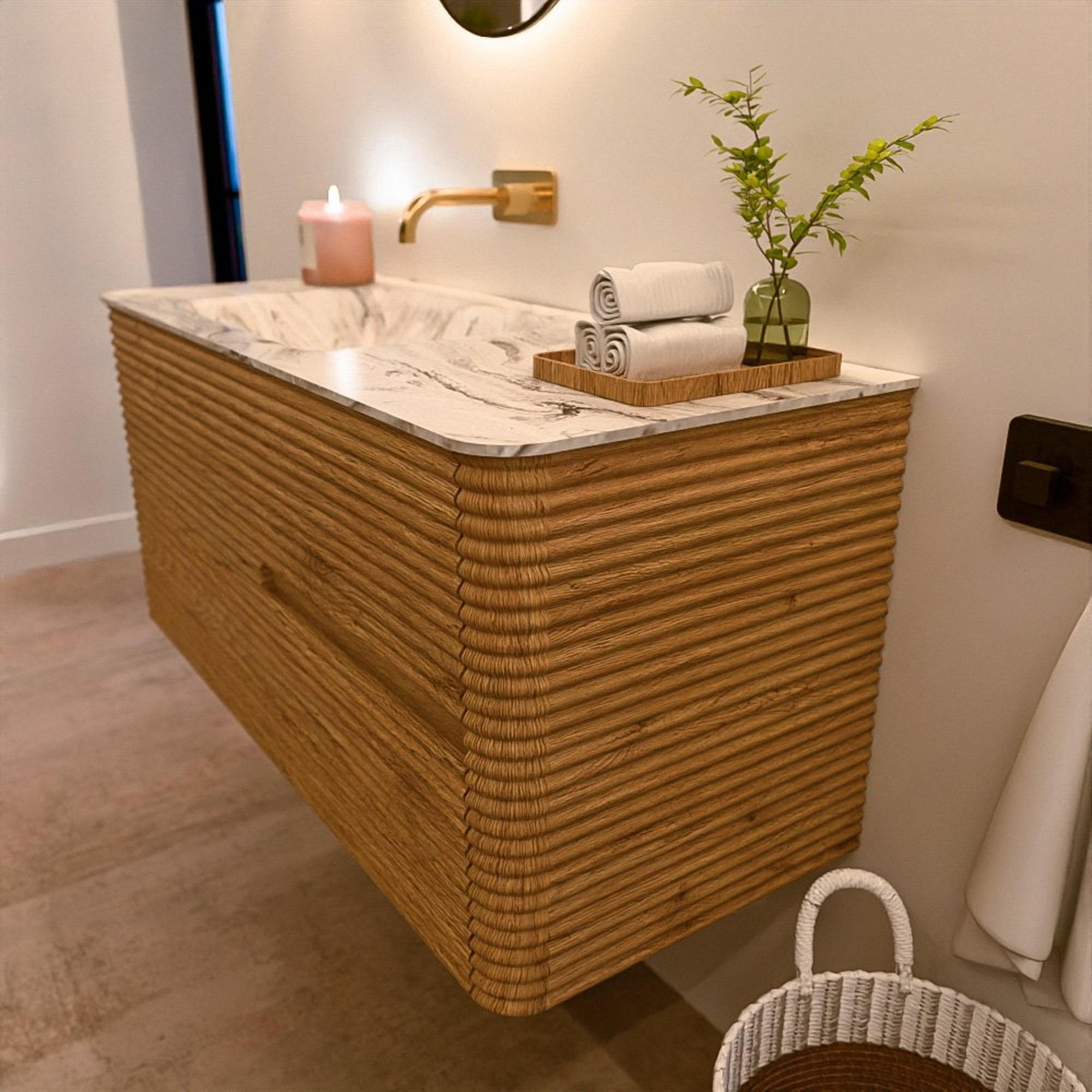 Mondiaz CIRO-DLUX Ensemble de meuble de salle de bains - 110x45x50cm - Vasque solid surface Glace - 1 lavabo à gauche - sans trous de robinet - 2 tiroirs - Chêne