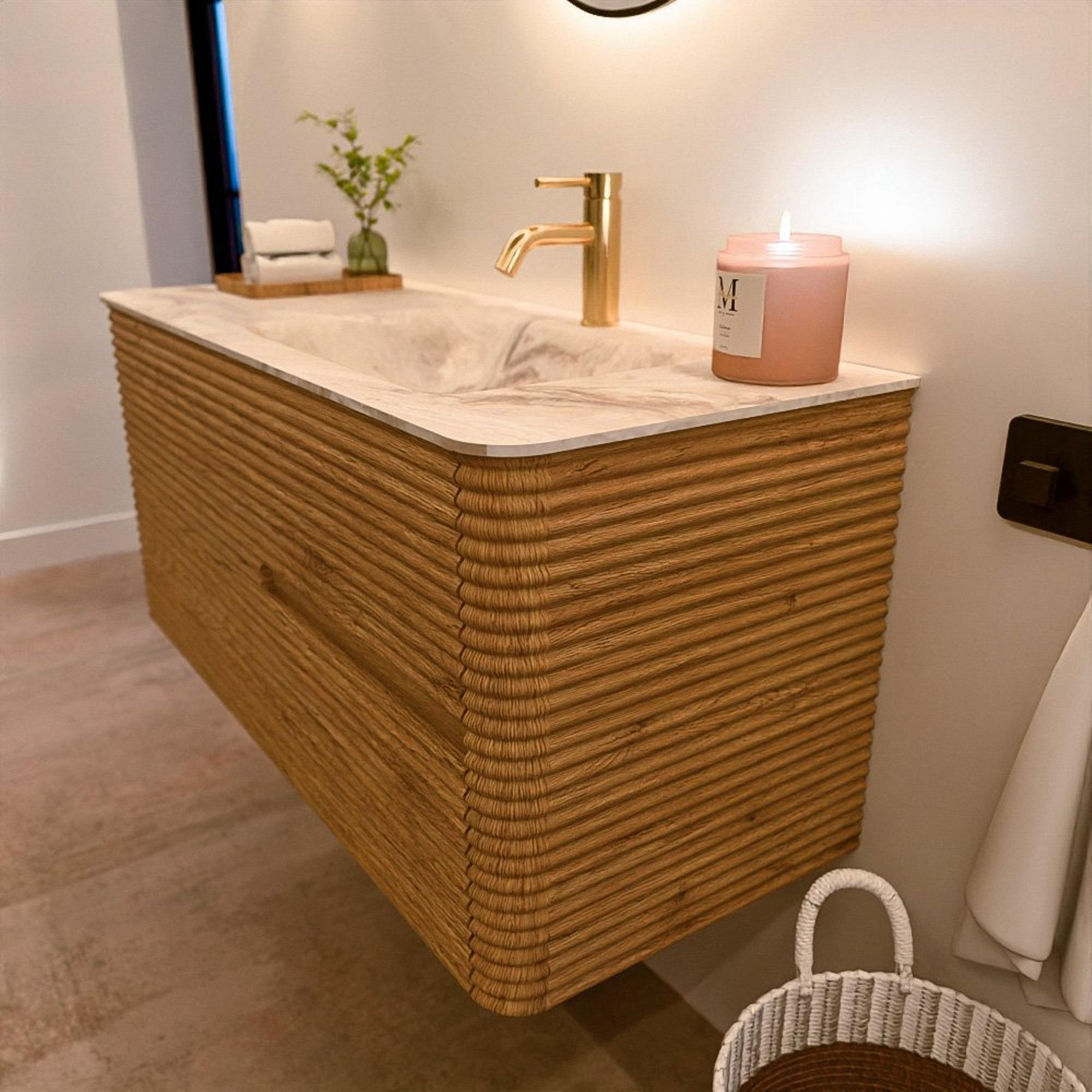 Mondiaz CIRO-DLUX Ensemble de meubles de salle de bains - 110x45x50cm - Plan-vasque solid surface Frappe - 1 lavabo à droite - 1 trou de robinet - 2 tiroirs - Chêne
