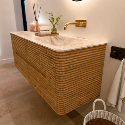 Mondiaz CIRO-DLUX Ensemble de meubles de salle de bains - 130x45x50cm - Plan vasque solid surface Frappe - 1 vasque à droite - sans trous de robinetterie - 4 tiroirs - Chêne