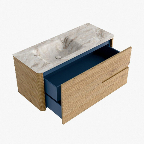 La praticité est un élément essentiel de la gamme CIRO. Le meuble dispose d’un grand tiroir avec un tiroir intérieur supplémentaire, idéal pour ranger de manière organisée tous les articles quotidiens de la salle de bain. Grâce à la poignée intégrée et au mécanisme de fermeture douce, la façade reste sobre, élégante et épurée.